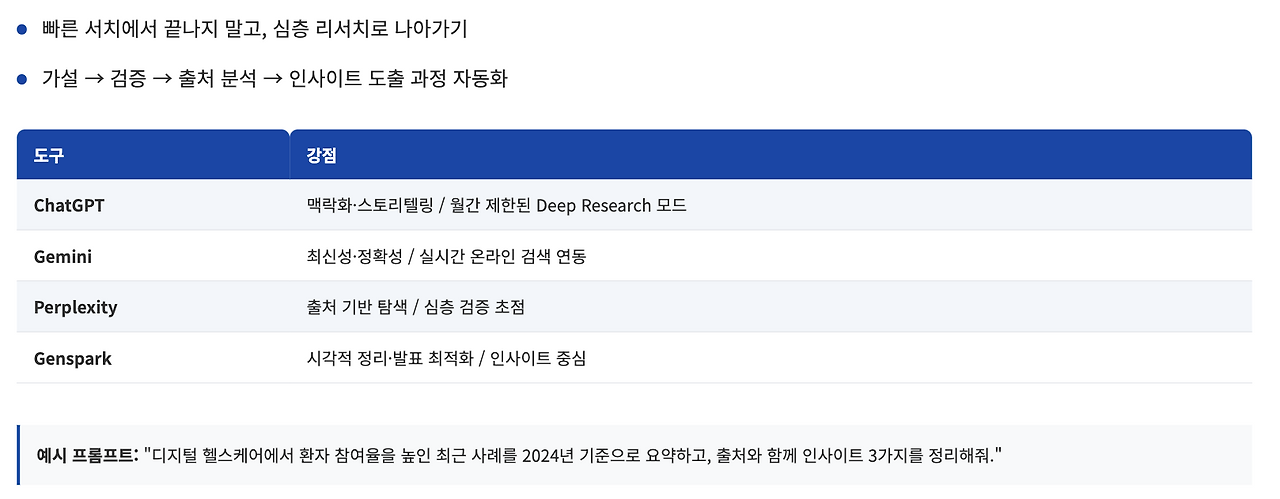 특히 Perplexity는 출처 기반 탐색이 강하고, Gemini는 최신성에 강하며, Genspark은 시각적 정리에 최적화되어 있다. 리서치 과정에서 AI를 단순 검색이 아닌, 사고 확장의 파트너로 쓰는 태도가 중요하다.