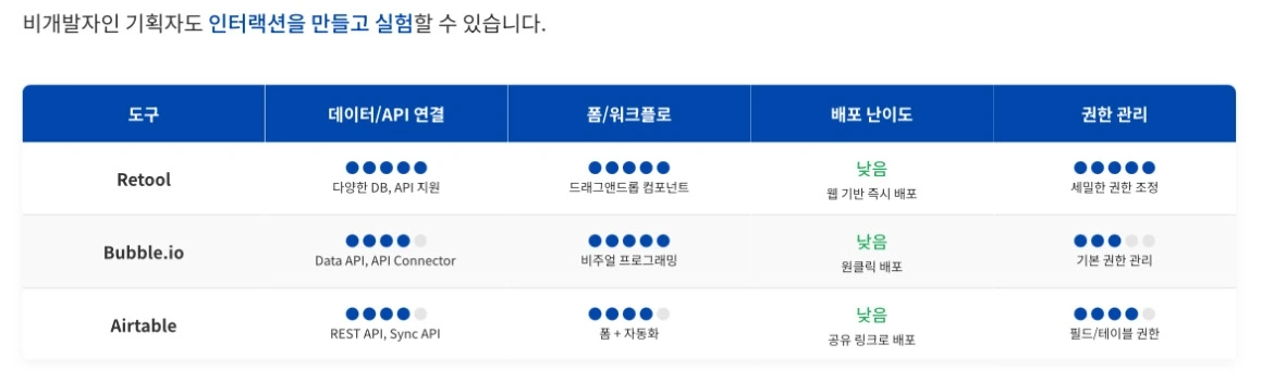 Retool, Bubble.io, Airtable 등은