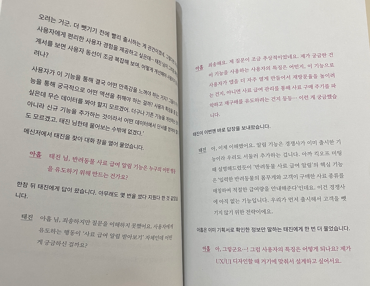 경수를 통해서는 성숙한 PM/기획자가 어떤 깊이로 사고해야 하는지를 배웠다면, 태진을 통해서는 현장에서 많이 만날 수 있는(내가 보여주기도 했던) 있는 그대로의 탑다운 과제에 대한 기획자의 모습을 보여준다.