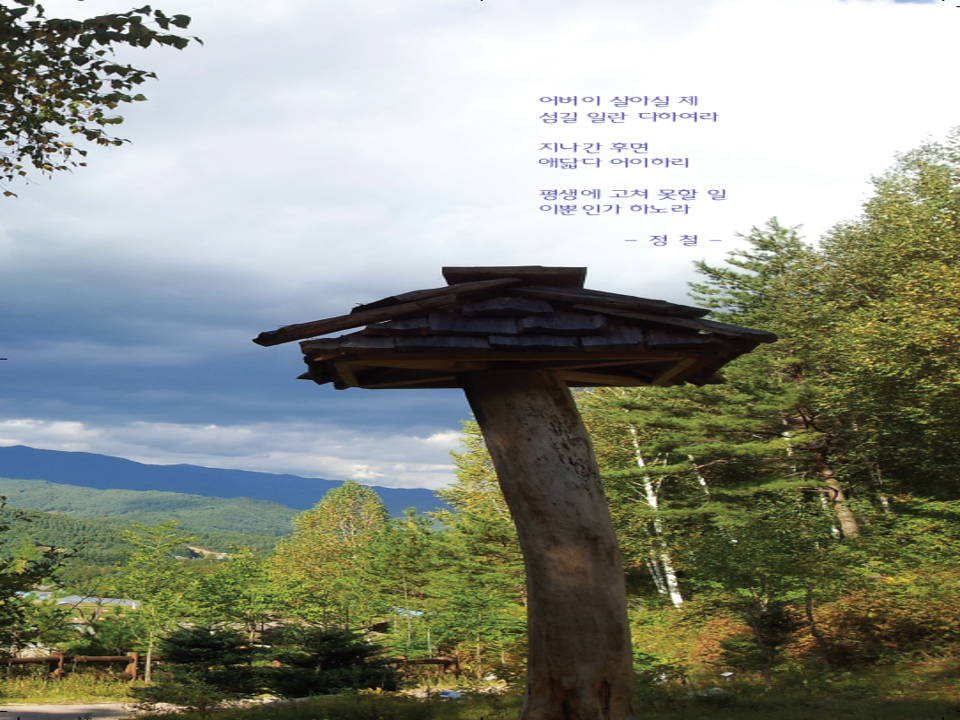 후회가 없을 수는 없겠지만 살아계실 때 함께 하는 시간을 더 많이 가져야 한다. 같이 모시고 살 수 있다면 최고의 효도이겠지만 살아 계실 때 전화 한 통, 한 번이라도 더 찾아뵈어야 한다. 정철 선생님의 말씀처럼 "어버이 살아 실제 섬길일란 다 하여야 한다.