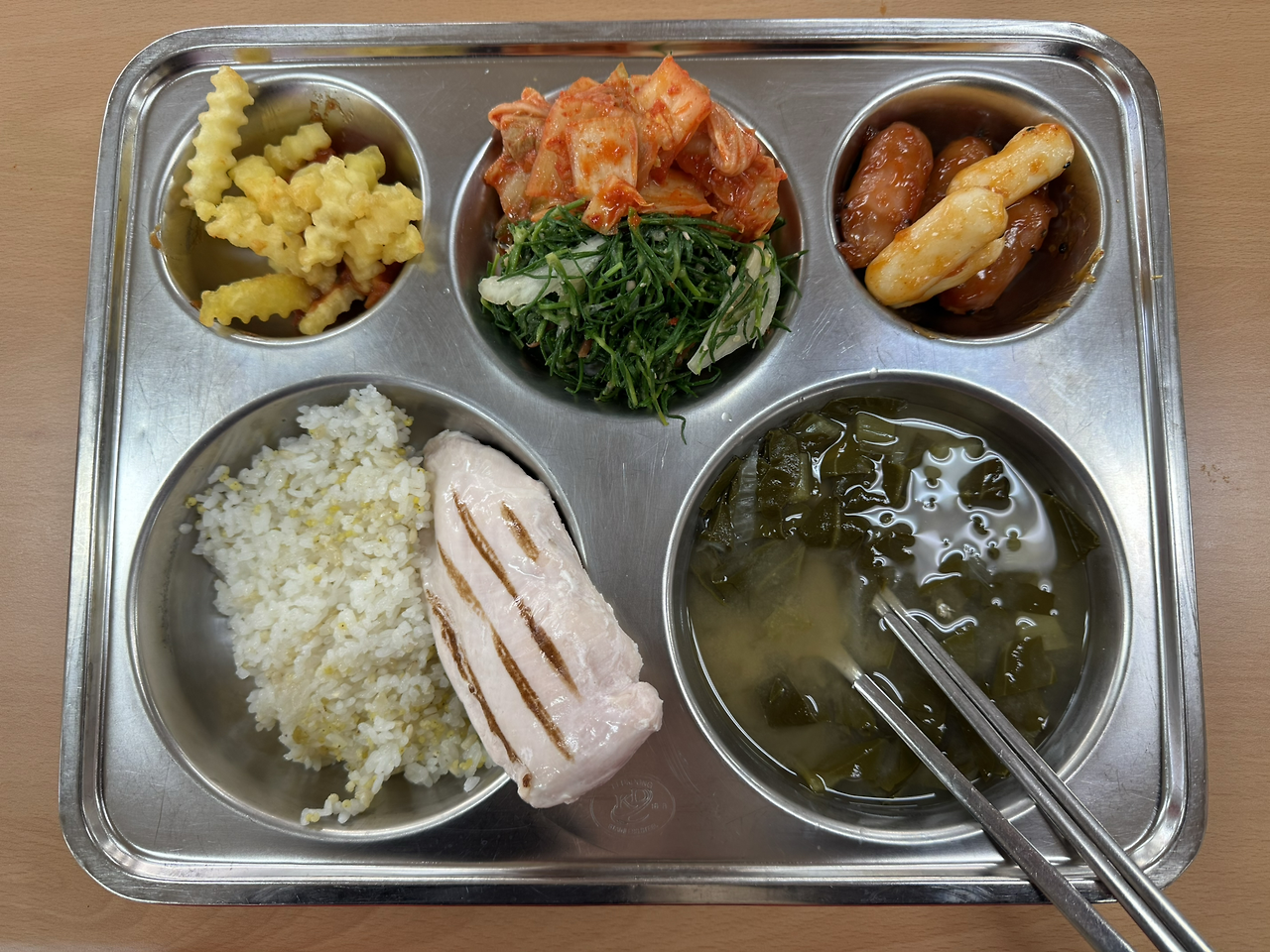 찰현미기장밥, 바지락근대된장국, 소시지떡양념구이, 세발나물무침, 배추김치, 감자튀김, 케첩