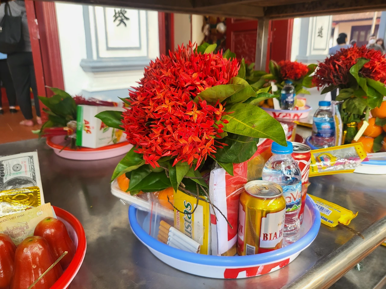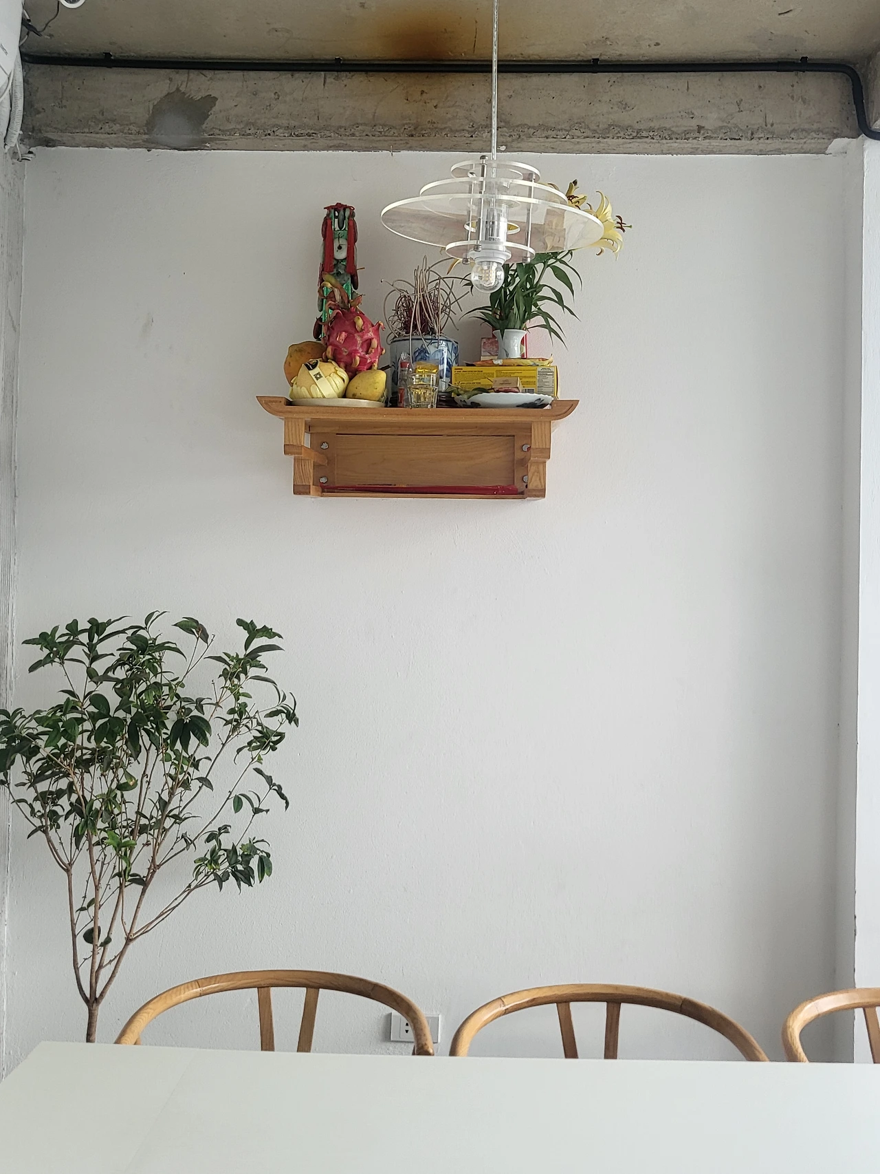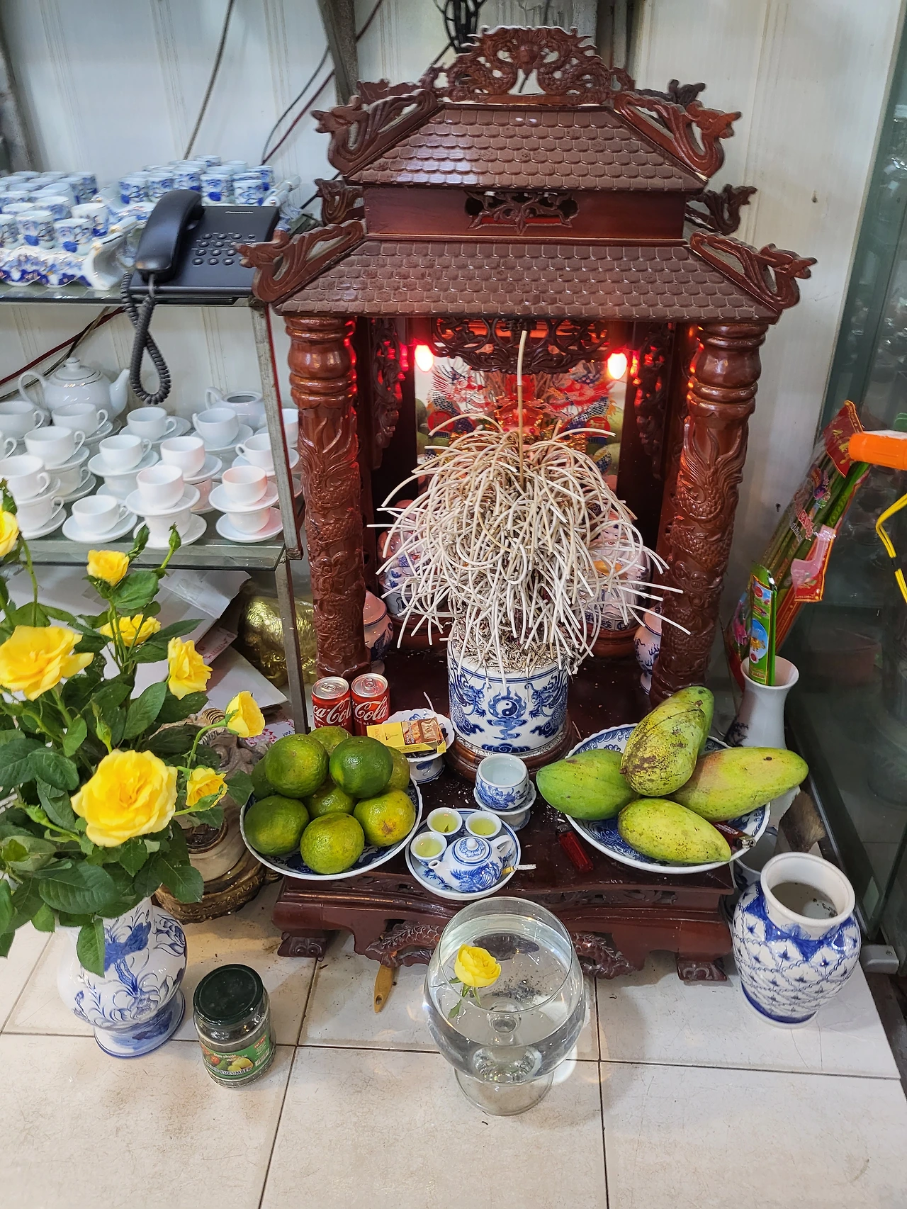 사실 하노이에 처음 왔을 때, 가장 신기한 광경이 제단이었다. 아무리 모던한 레지던스나 카페에도 제단은 빠지지 않는다. 작은 나무 테이블 그리고 화사한 꽃, 각종 과자와 과일이 환한 불을 받아 빛난다. 하루는 레지던스 로비의 정중앙에 위치한 제단 주위를 빙글빙글 돌다 성큼성큼 다가섰다. 그걸 본 이웃집 내니 H는 곧바로 나를 제지했다. 그녀는 제단은 사업장뿐만 아니라 각 가정에도 있다고 설명했다. 사업장은 부를 상징하는 다섯 신을 그리고 가정은 조상신을 위한 것이라며 함부로 할 대상이 아니라고 덧붙였다. 내가 무슨 짓을 한거지? 역시 무식하면 용감하다. 신성시 할 제단을 무슨 크리스마스 트리보듯 했으니 그녀로서는 얼마나 조마조마 했겠나.