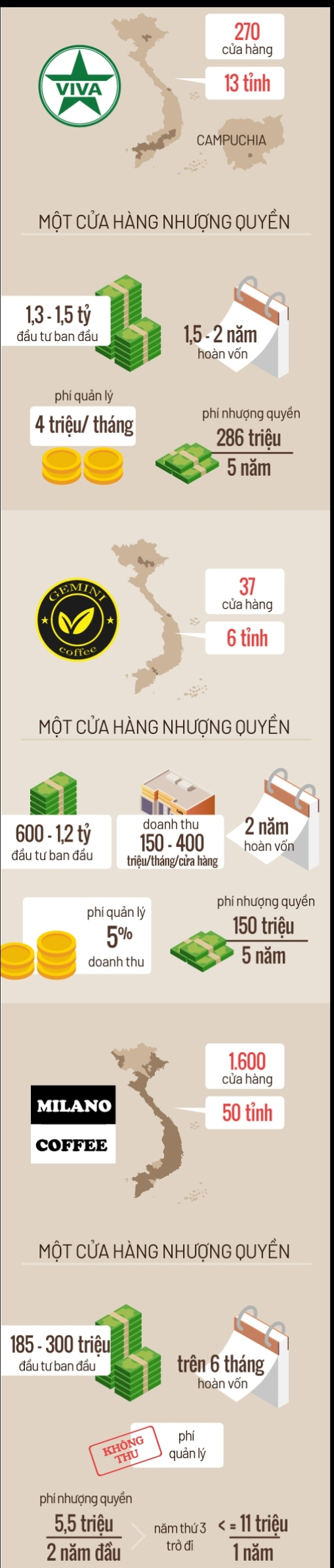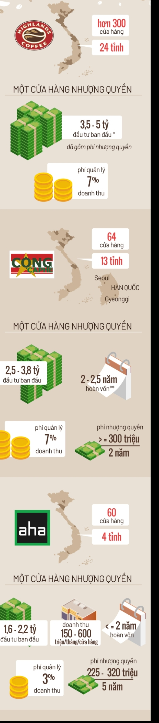 특히 베트남은 로컬 커피 브랜드가 상당히 많다. 흔히 아는 Highlands Coffee는 물론 Coffee House, Phuc Long 그리고 한국인들의 최애 브랜드인 Cộng CàPhê 등이 그렇다. 그중 20년 전부터 시작된 최대 브랜드는 단연 Highlands Coffee다. 일명 베트남 스벅으로 불리며 한 번이라도 여행을 와본다면 모두 한 번은 만나게 된다. 고급화 마케팅을 선보이며 엄격한 매장관리를 주도하지만 프랜차이즈 비용 또한 가장 비싸다. 가입 수수료는 35억 - 50억 동으로 약 152,000 - 217,000 달러를 웃돈다. 300개 이상의(500개로 추정) 지점을 보유해 가장 성공적인 기업으로 불리며 그 뒤로 한국인이 가장 사랑하는 Cộng CàPhê 콩카페가 64개로 2위다. aha Cafe 아하 카페 또한 빠질 수 없다. 60개의 지점 수로 콩카페 뒤를 바짝 추격 중이다. 이외에 Coffee House 커피 하우스(150개 이상)나 Viva Coffee 비바 커피, Phuc Long 푹 롱 커피 등 다양한 브랜드가 있다.