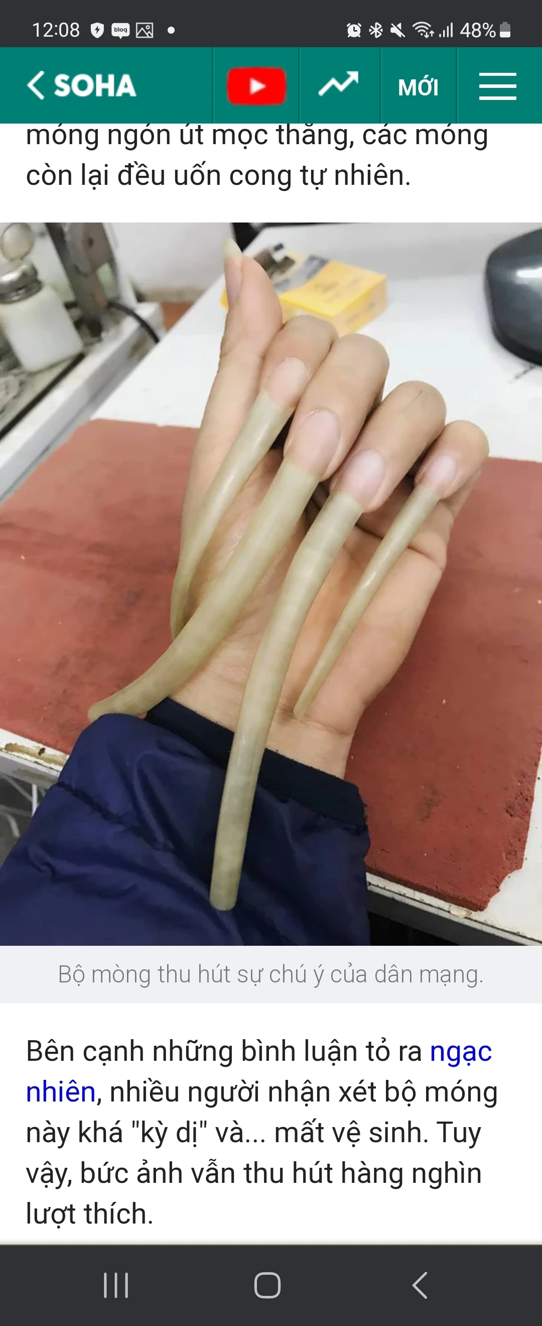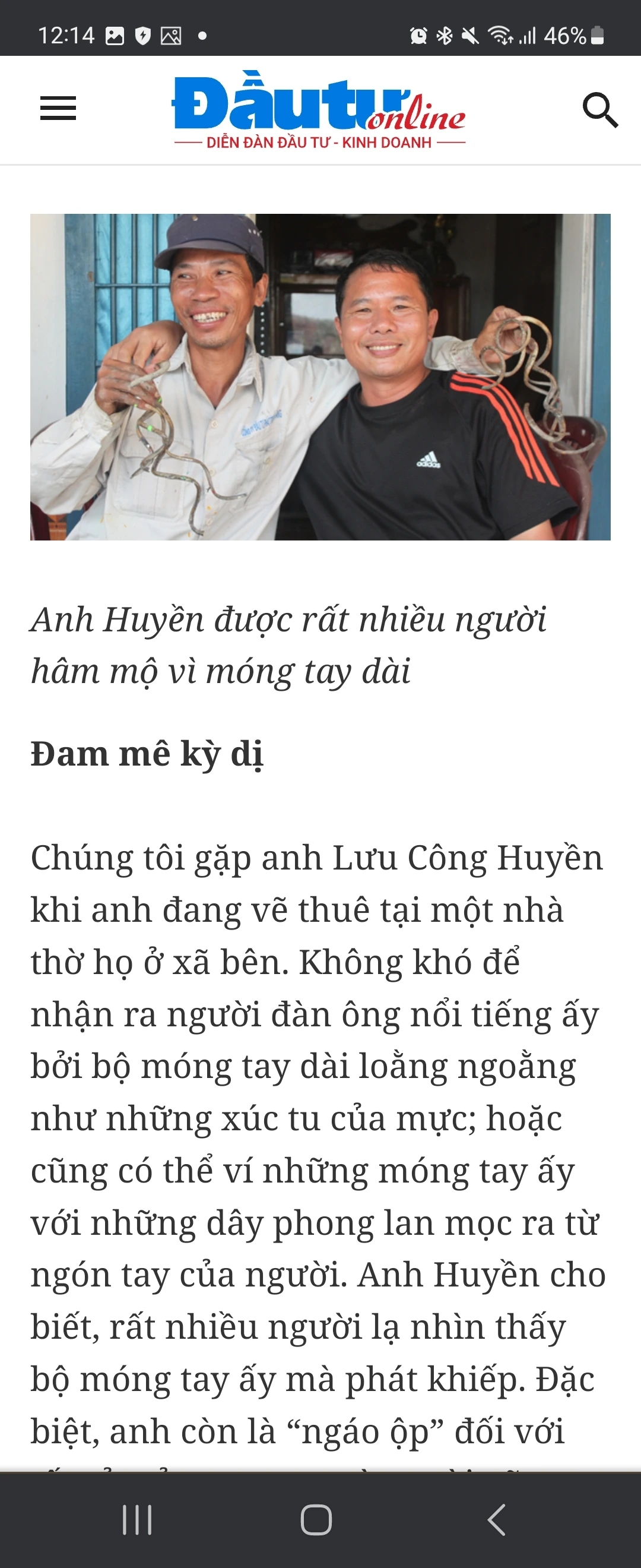 평등의 상징이자 노동의 가치를 가장 높이 쳐야 할 사회주의가 노동을 부정적으로 보는 것도 모자라 부유함을 동경한다굽쇼? 손톱이 길면 힘든 노동을 하지 않아 부유층의 인상을 준다는 말에 놀랐다. 여기에 이성에게 어필하려는 허세 또한 더해졌다고 하니.. 순간 길에서 본 현대판 한량, 모닝커피 타임을 즐기던 사나이들이 떠오르지 말입니다. 흡연과 해바라기 씨앗으로 대낮의 수다를 즐기는 남자들의 참신한 매력 어필 포인트! 어의가 로그아웃 하셨습니다. 실제로 긴 손톱을 기른 남자들은 기사화되기도 했다. 특히 아잉 리우 꽁 후옌(Lưu Công Huyền)은 보도될 당시 34년간 기른 손톱으로 화제가 되었다. (지금까지 기르는 중이라면 40년을 훌쩍 넘겼다.) 한 번은 손톱 하나가 절단되는 아픔을 겪었는데, 당시 우울증을 겪을 정도로 힘들었기에 또 부러지면 고통에 죽어버릴 것이라고 했다. 부부는 당연히 각방 확정, 비가 오면 손톱에 비닐을 씌우는가 하면 옷을 갈아입을 때도 도움이 필요하다. 불면 날아갈까 만지면 부서질까, 어떤 보물보다 극진한 대우를 받는 손톱이다. 이쯤 되면 손톱과의 로맨스로 불려도 될 정도다. 그가 손톱 자랑에 여념이 없는 동안 부인은 묵묵히 집안일을 하더라는 대목이 잊히지 않는다. 그의 아성에 도전하는 후발주자도 있다. 기른 지 5년이 된 Phân Đức이다. 12 센티가 된 그는 1990년 생으로 젊은 피에 해당한다. 30대 초반의 그는 놀랍게도 Yên Bái에서 휴대폰 수리를 한다. 12 센티의 손톱으로 정교한 손동작이 요구되는 수리가 어떻게 가능한 걸까. 각자 지역 명물(?)로 많은 관심과 애정을 받는다고 한다. 하지만 실제 이성에게도 어필이 되는지 확인하고 싶은 호기심이 발동했다. 주위에 아는 베트남 여성들에게 질문을 던져 본다. 손톱이 긴 남자들을 어떻게 생각하냐고 말이다. 돌아오는 답은 열이면 열! 질색하더라. 역시 국경을 초월해 긴 손톱 남자는 매력적 일리가 없다. 그저 게으르고 비위생적으로 보인다는 답만 했다. 누구도 반기지 않는 롱 네일 유행을 하루빨리 포기하는 날이 오길, 플리즈~(20대의 베트남 친구는 코를 파려고 기르는 것 같다는 참신하지만 설득력 있는 답을 내놓기도 했다.)