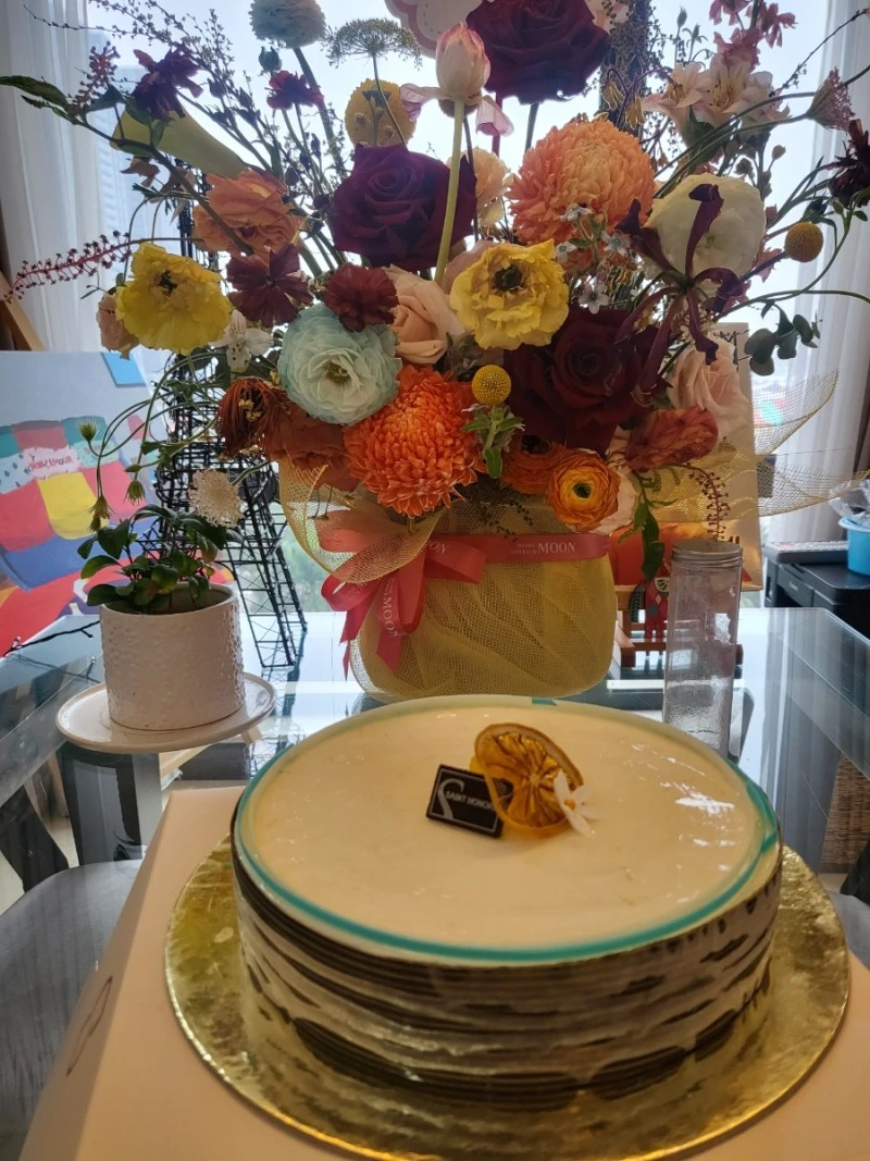 그러고 보니.. 올해 내 생일이 어땠더라. 달콤하다 못해 평생 섭취할 당분을 죄다 흡입한 그날! 올해는 그야말로 공포와 혼란의 절정이었다. 겨울과 봄의 경계에 태어나버린 1인! 그래서일까. 한 여름, 약한 선풍기 바람에도 오들오들 떠는 추위 최약체이지만 내면은 뜨겁게 불타오르는 정열적인 성향을 타고났다. 겨울적 봄스러운 모순의 인격체! 그리고 40을 훌쩍 넘기고 보니 꽂을 촛불이 많아져 서글퍼지기 시작한다. 마냥 축제 같았던 생일이 이젠 기쁘지만은 않은 건가. 그래서 초는 라지 4개에서 올스톱하기로 했다. 여기서 더 이상 보태지 않기로 약속해요~