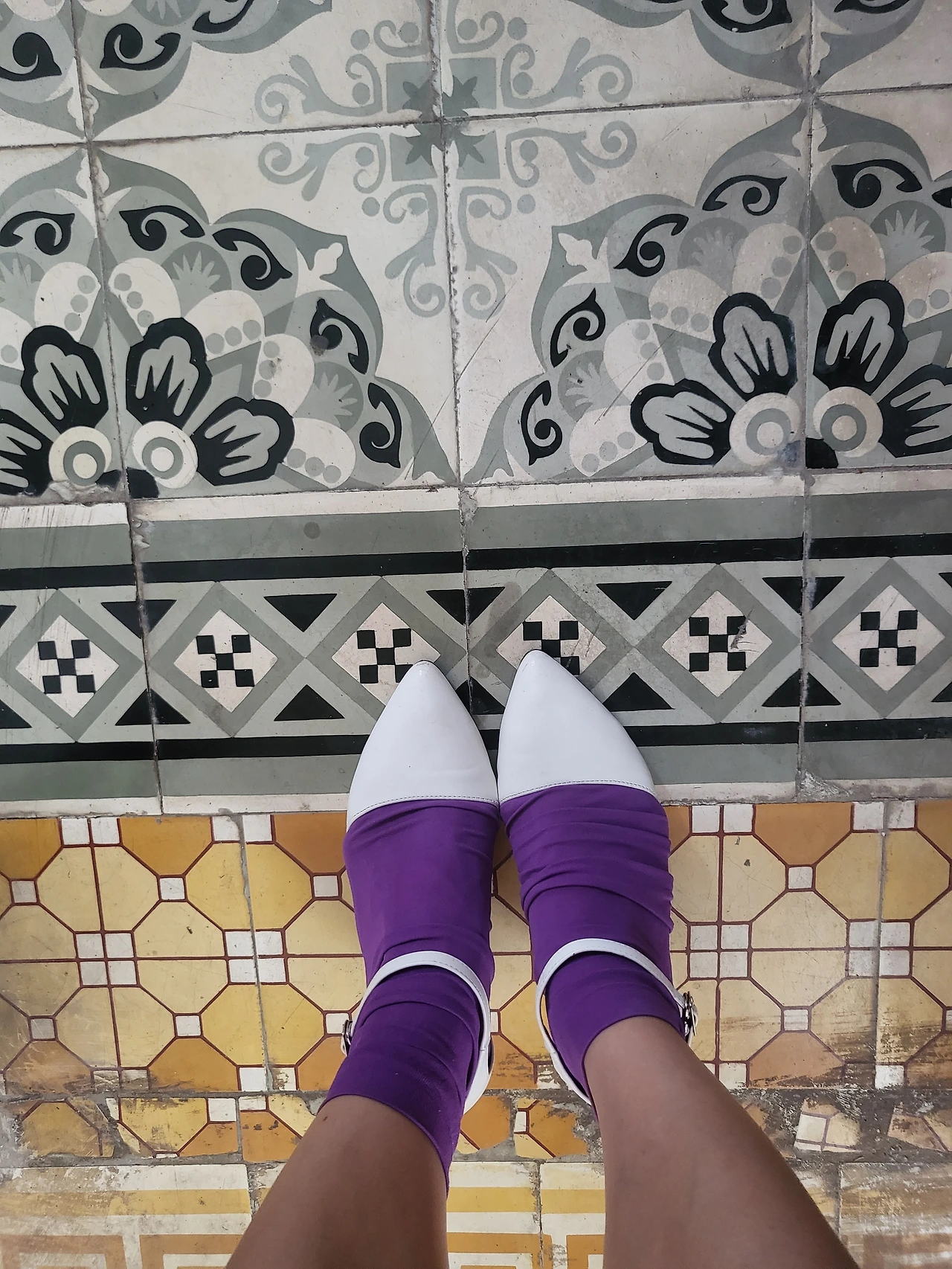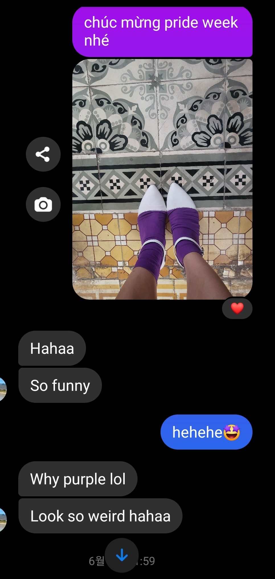 최대한 참하게 보이고자 애써야 하는 날이 바로 학부모 상담이다. 하지만 소심한 지지도 하고 싶지 말입니다. 그래서 택한 게 뭐다? 바로 삭스! 양말이다. 백만 년 만에 꺼내 신어 보는 새하얀 구두와 ‘퍼플‘양말의 하모니! 여기서 끝나면 섭섭하다. 알록달록 목걸이에 옐로 빅백을 둘러매고 출동! 그리고 연인이자 사업 파트너로 매일을 햄 볶는 깨소금 게이 커플에게도 사진을 보냈다. “chúc mừng pride week!”라고 말이다. 물론 퍼플 양말 사진은 덤이다. 이에 박장대소를 터뜨린 H! 답에서 까르르~하는 유쾌한 그의 웃음소리가 들리는 것만 같다. 양말 사진을 본 그는 ’Weird’라고 했지만 말이다.