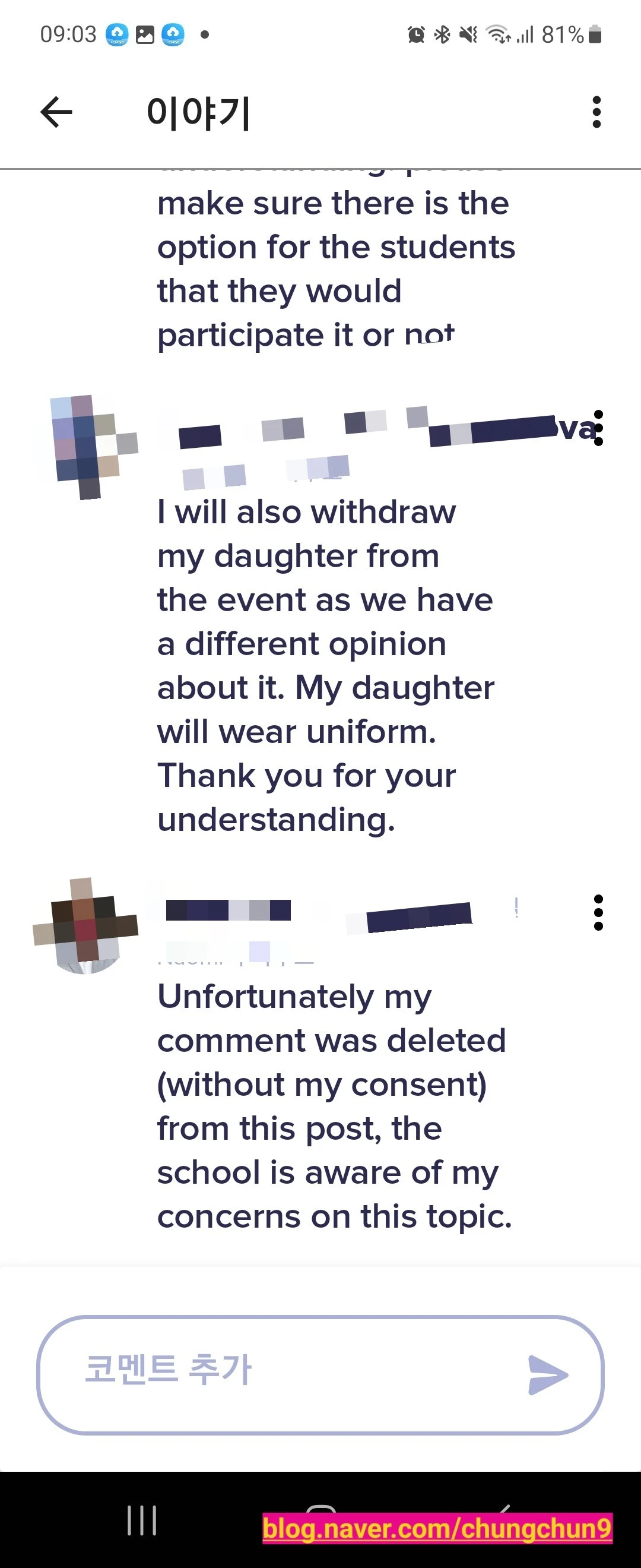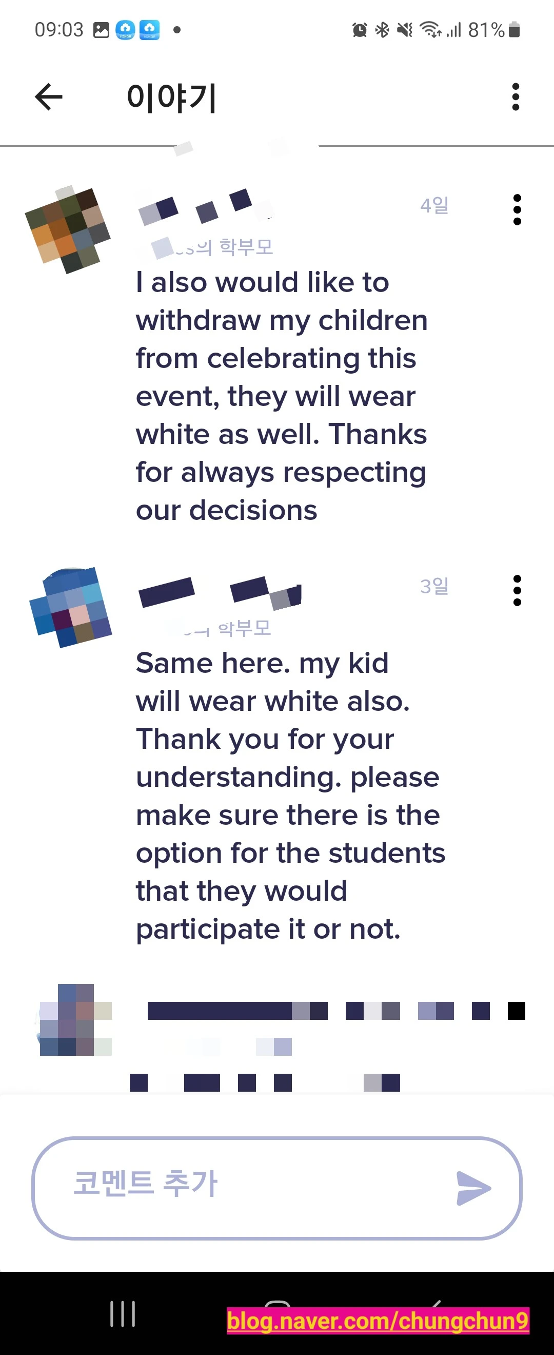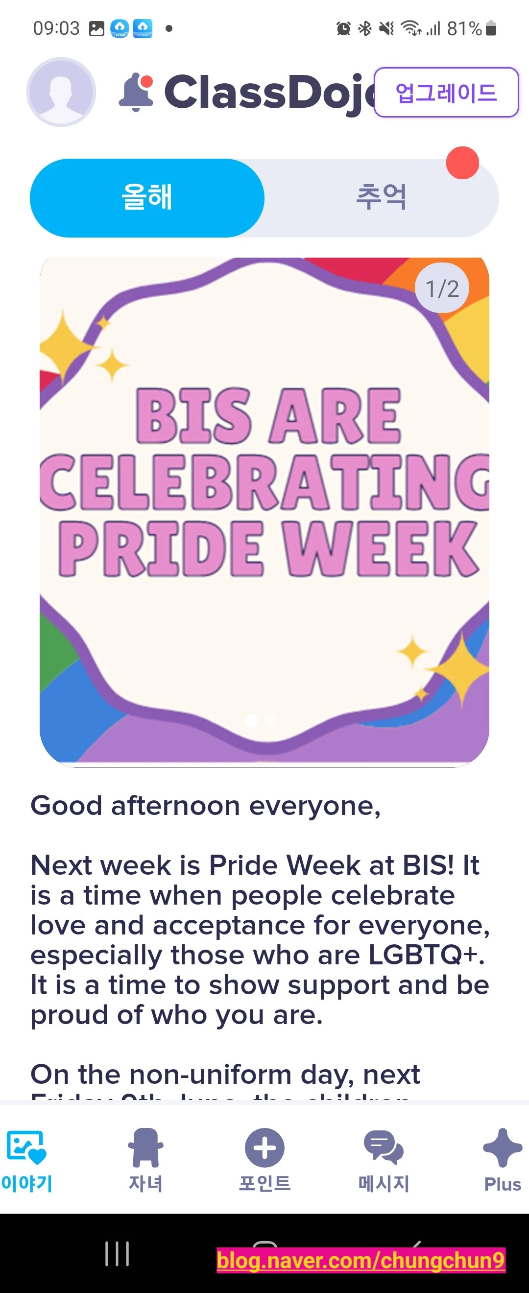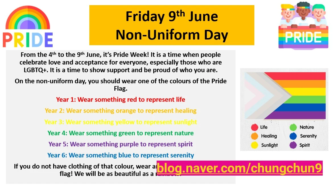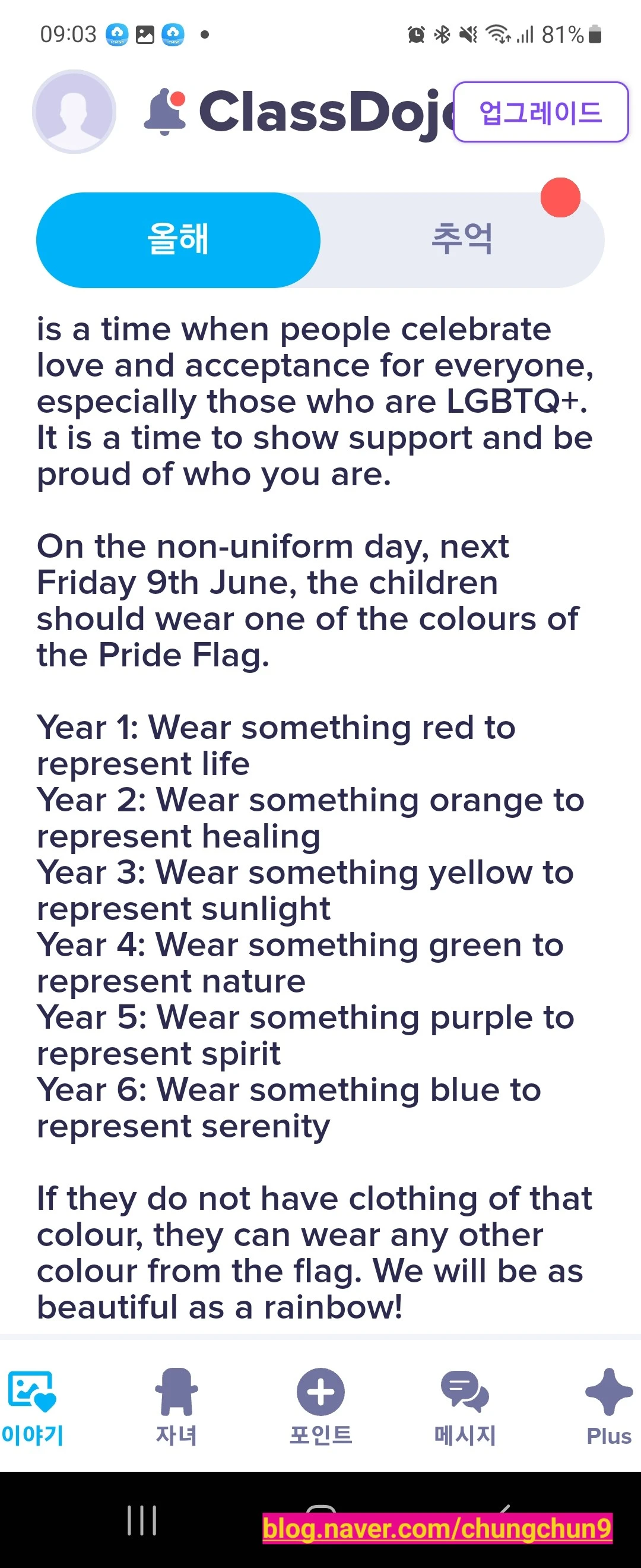 알럽 유니폼~ 한국에서도 어린이집, 유치원을 빼고 줄곧 유니폼만 입어 온 쩡이와 쭌이! 덕분에 신속한 등교 준비가 가능했지 말입니다. 유니폼, 뽀에버! 하지만 하노이에서는 이벤트성 논 유니폼 데이가 분기에 하루 이틀은 있다. 지난 금요일이 바로 그날이었다. 이번에도 학교 단체 메일을 스팸처럼 사뿐히 거른다. 이틀 전, 딸을 통해 급히 들어서 다행이지만 말이다. 학년별로 정해진 컬러로 옷을 입으라 굽쇼? 일곱 빛깔 무지개는 노랑, 초록도 있는데 말이죠~ 노랑, 초록, 주황 등 걸리면 일회성 새 옷 찾아 강제 쇼핑을 떠나야 할 판이다. 두근두근, 공지를 확인한 결과, 6학년은 블루! 브라보! 파랑은 해볼 만하다. 우리에겐 청청 패션이 있잖아요~ 마침 세컨더리, 쭌이도(8학년) 블루, 당첨! 세상에서 프라이드 위크가 제일 쉬웠어요~ 이런 미션은 쌍수 들고 환영한다. 스릉흔드~ 프라이드 위크!