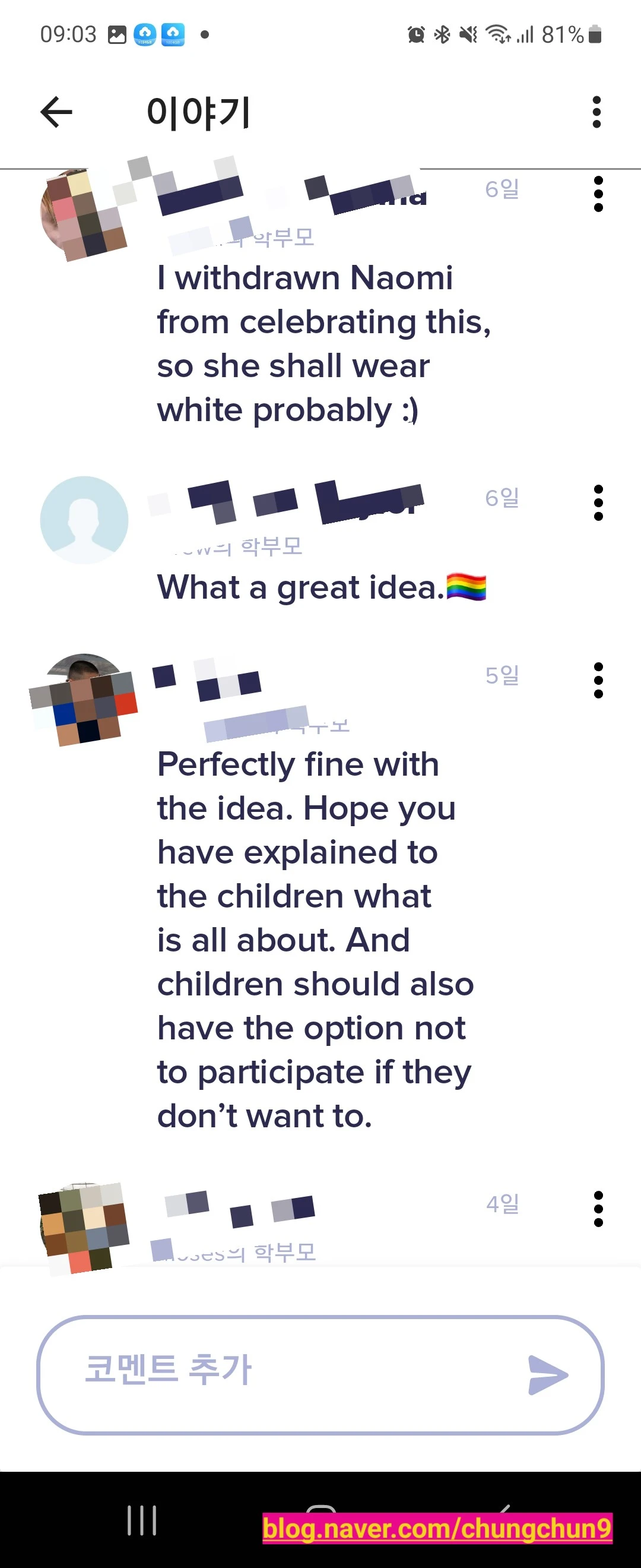 2주 있으면 베트남을 떠날 P, 미국 장기 출장을 앞둔 포르투갈의 E와 비어 타임을 가졌다. 그리고 뜻밖의 소식도 접했다. “Min, 댓글 확인 안 했어?” 질문에 감을 전혀 잡지 못했다. 평소 학교 소식을 꼼꼼히 체크하고 알려주던 프렌치 메신저, ㅍ의 말에 동공지진이 일었다. 뭘 놓친 거지? 공지는 모두 확인했는데…... “Oh, this is why I like her. 내가 이래서 민을 좋아한단 말이야.” 가볍게 웃으며 내 손을 잡는 그녀! 파란 의상 준비에 꽂힌 엄마는 어떤 이슈에도 눈치채지 못했지만 댓글은 이미 뜨거웠다. 몇몇 학부모들이 반발의 코멘트를 달았고 학교는 이를 삭제하며 더 큰 반향을 산 것이다. 반발이 심해지고 아예 자녀들은 유니폼을 입고 등교할 것이며 이벤트에 참여시키지 않겠는다는 의사를 표명했다. 댓글은커녕 공지에도 한발 아니 두발 늦은 1인은 멍해진다. 프라이드 위크 이벤트에 어떤 저항도 없던 나와 달리 이어진 열띤 논쟁! 학교에서 할 행사로 타당한 지를 따지던 그녀들은 열정적으로 의견을 피력했다. P은 물론 아들을 다른 국제 학교에 보내는 E도 불만을 토로하긴 마찬가지다. 사실 그녀의 아들 J는 고작 만 6세다. 동료나 친구들 중 게이 커플도 많아 적대감은 없다고 재차 강조를 하지만 일주일 내내 성소수자들에 대해 배운 아들이 집에서 질문을 한 모양이다. 사실 여섯 살 된 남자아이로서 당연한 반응이다. 이에 학교에서 이렇게 중요한 사안으로 거론되는 이유를 알 수 없다며 혼란을 야기하는 것 같아 걱정스럽다고 했다. 쩡이의 절친 동갑내기(11세) 딸, M을 둔 P 또한 입장은 같았다. 성교육만으로도 많은 질문과 궁금증을 가질 시기에 이른 나이에 여러 정보가 한 번에 주입되는 것에 우려를 표했다. 정치와 마찬가지로 하나의 이데올로기가 개입되는 것도 부정적으로 바라보고 말이다.