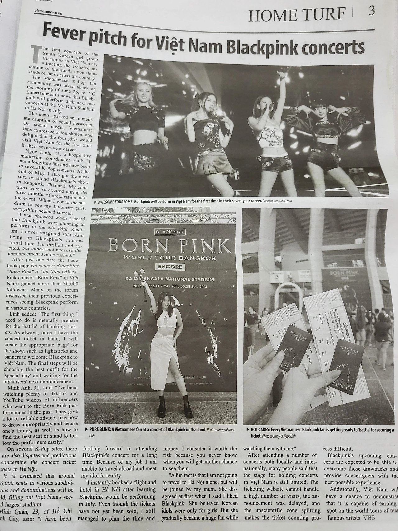 케이 팝의 인기는 두말하면 숨차다. 유치원생들도 아는 동남아시아에서의 한국 가수의 위상이란! 그리고 지난 5월 28일, 블랙핑크의 첫 단독 콘서트가 방콕에서 열렸다. 초특급 태국 배우들도 앞다투어 티켓을 사고 공연 인증숏을 업로드하며 SNS가 뜨거웠다. 얼마 전 브루노 마스의 공연에서 한국 스타들이 대거 관람한 게 오버랩되는 순간이다. 한국도 세계적 수준이 된 건가~ 멋대로 으쓱하며 수출용 애국심을 수혈하곤 했다. 많은 베트남 팬들 또한 태국까지 가서 관람을 했다. 인기를 생각하면 놀랍지 않다. 특히 리사는 계급 사회인 태국에서 ‘평민 출신’으로 최고의 자수성가로 손꼽힌다. 이게 바로 태국인들이 리사를 보고 열광하는 이유다. 그런 블핑이 드디어! 월드투어 ‘Born Pink’ 추가공연으로 하노이에 상륙한다. 7월 29일과 30일 , 가까운 ‘미딩 스타디움 Mỹ Đình Stadium ’에 말이다. 우리 동네에 슈퍼 울트라 월드 스따아~가 뜬다고? 신문 기사를 읽으며 쩡이와 나는 가슴이 둑훈둑훈!!