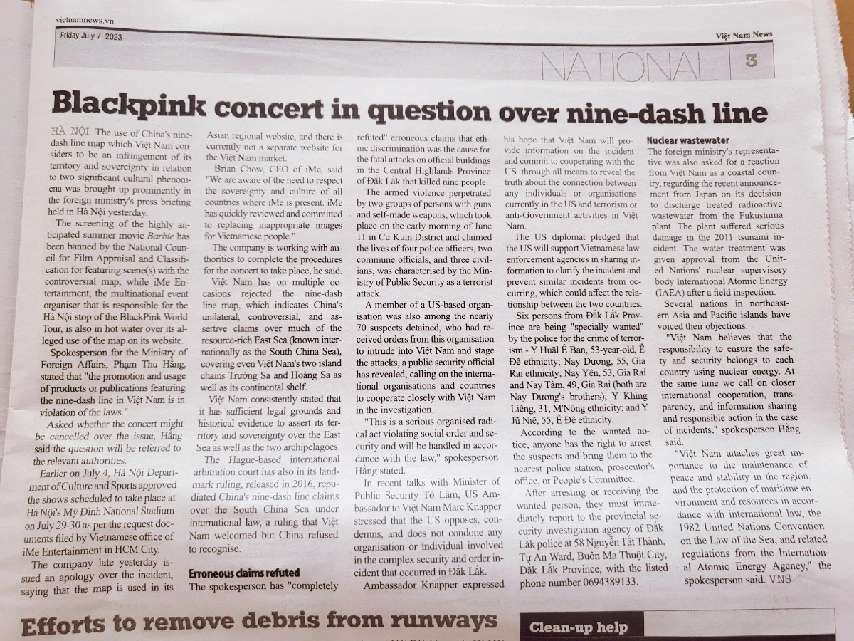 블랙 핑크 월드 투어를 향한 우려의 목소리가 높다. 취소를 요구하며 불매운동까지 이어질 위기다. 문제는 공연 주최자인 iME 엔터테인먼트의 공식 웹사이트에서 시작되었다. 남해구단선 지도가 표기되어 있었기 때문이다. 중국에 본사를 둔 다국적 기업인 iME 엔터테인먼트는 공식 사과와 함께 빠르게 지도를 삭제했다. 발 빠른 대처를 했지만 언론매체는 여전히 지도를 언급하고 있다. 미딩에 사는 모녀는 무사 콘서트가 열리길 기도합니다.