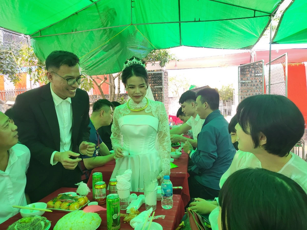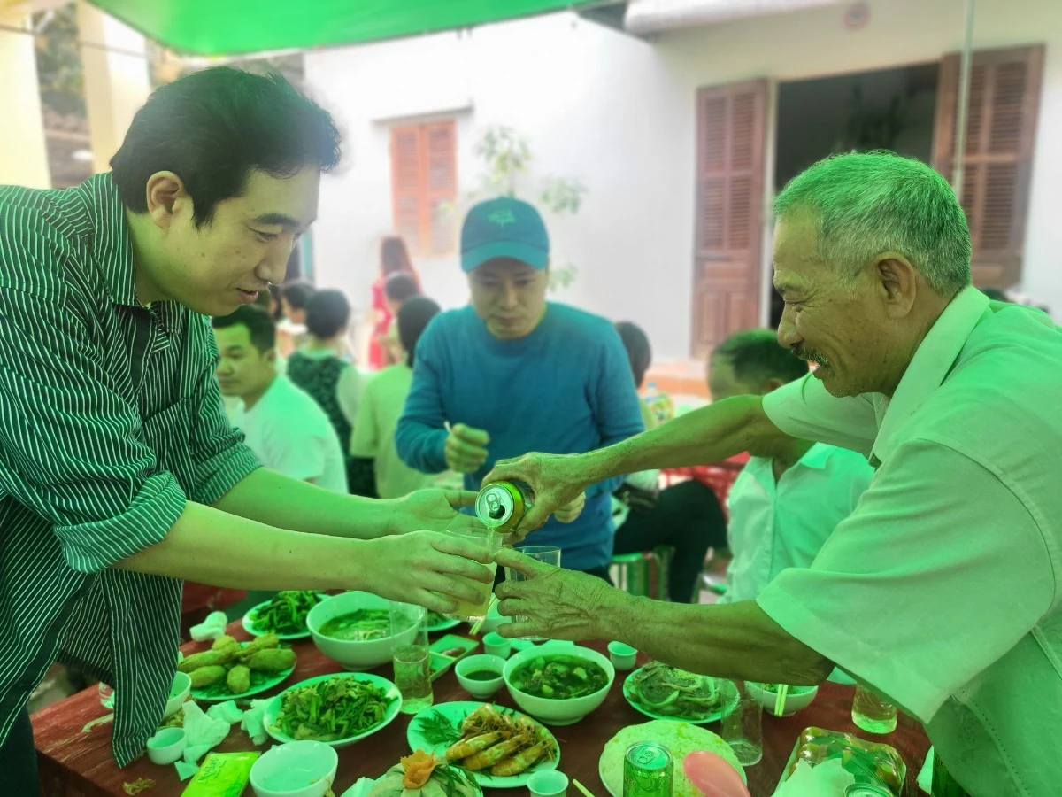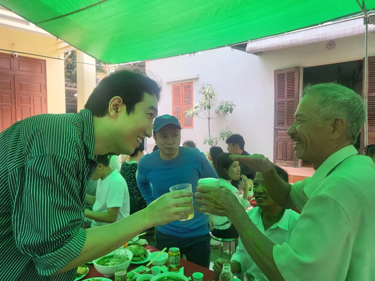 국경을 넘어 결혼식이라면 빠지지 않는 건 무엇? ‘지오우 rượu, 오사케 お酒, 알코올 alcohol’되시겠다. 문턱을 살포시 넘어 옆 마당으로 가니, 금실을 두른 빨간 식탁보를 입은 테이블들이 정렬되어 있다. 음식도 하나둘씩 놓였다. 이때 본격적인 광란의 술판 스멜을 예감한 건 나뿐일까. 이거 쉽지 않은 싸움이 되겠는걸! 그리고 순식간에 불길한 예감은 현실이 되었다. 모두가 한마음 한뜻으로 남편을 애타게 불렀다. 회사 직원들 뿐만 아니라 온 동네 사람들이 ‘sếp, 셉(상사를 부르는 호칭)’을 외친다. ‘셉’이란 호칭이 익숙한 남편은 점점 분주해졌다. ‘một hai ba, hai ba! 하나 둘 셋, 둘셋‘의 구령과 함께 음주에 시동이 걸렸다.