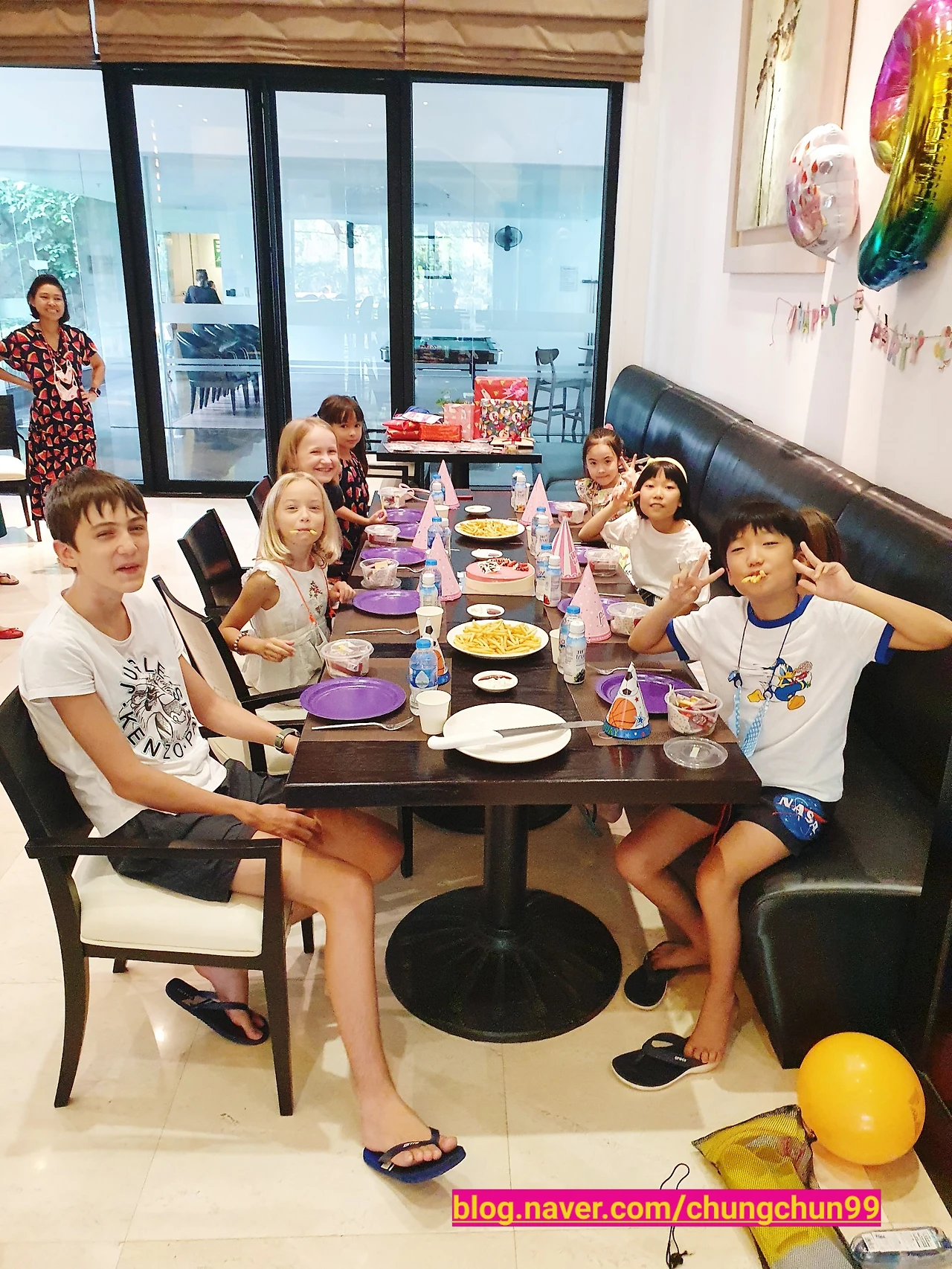 하노이 생활을 시작한 초반에도 쭌이는 제법 영어를 알아듣고 누구와도 잘 어울리는 녀석이었다. 토킹 머신인 쭌이가 본인이 하고 싶은 말을 다 못 해서 스스로 답답해할 뿐이었다. 반면에 부끄럼 많던 쩡이는 실제로 초반에 누가 다가와도 쉽게 친해질 수 없었다. 나의 오래비 그러니까 쩡이의 외삼촌이 조카의 목소리를 들어본 적이 없다고 하면 말 다 한 게 아닌가. 그것도 우린 바로 옆 동에 살아 일주일에 한 번은 모여서 저녁을 먹었는데 말이다. 가뜩이나 수줍어하는 성격인데 영어도 안되니, 주눅이 많이 들었을 것이다. 일본인 친구ㅈ의 엄마가 하루는 이런 말도 했다. ㅈ보고 쩡이가 동갑이니 같이 놀자고 가서 말을 걸어보라고 했단다. 그런데 ㅈ이 "쩡이 쟤는 말을 걸어도 답이 없어. 아무 말도 안 해."라고 했다는 것이다. 확실히 나도 그런 쩡이를 다그치고 왜 대답도 제대로 안 하는지 답답해하던 적이 있었다. 남편과 이야기할 때도, 쩡이가 또래의 친구들에게 매력이 떨어질 수 있다며, 다른 친화력 좋은 친구들과 비교를 했던 적도 말이다. 엄마끼리 친한 건 둘째치고 아이들이 서먹하니 쉽사리 친구가 되기 어려워 마음이 쓰였던 것 또한 사실이었다. 지금 생각해 보면 아이마다 적응하는 속도가 다 다른데, 엄마가 너무 조급해하지 않았는지, 그리고 은연중에 아이를 채근하고 다그친 건 아니었는지 미안한 마음이 든다. 지금은 ㅈ과 둘이 만나면 스파클이 파바박 튈 만큼 수다 삼매경이다. 심지어 문 잠그고 들어가면 절대 나오지도 않는다. 둘이서 대체 뭘 하는지 모를 일이다. 그리고 피비의 까다로운 프렌치 소녀들과도 파자마 파티를 하고 매일 수영장에 같이 갈 정도로 친하다. ㅇ과도 만나면 더없이 반가워하며 잘 지낸다. 쩡이의 생일 파티에도 모두 일정을 변경해가며, 한 걸음에 달려온다.