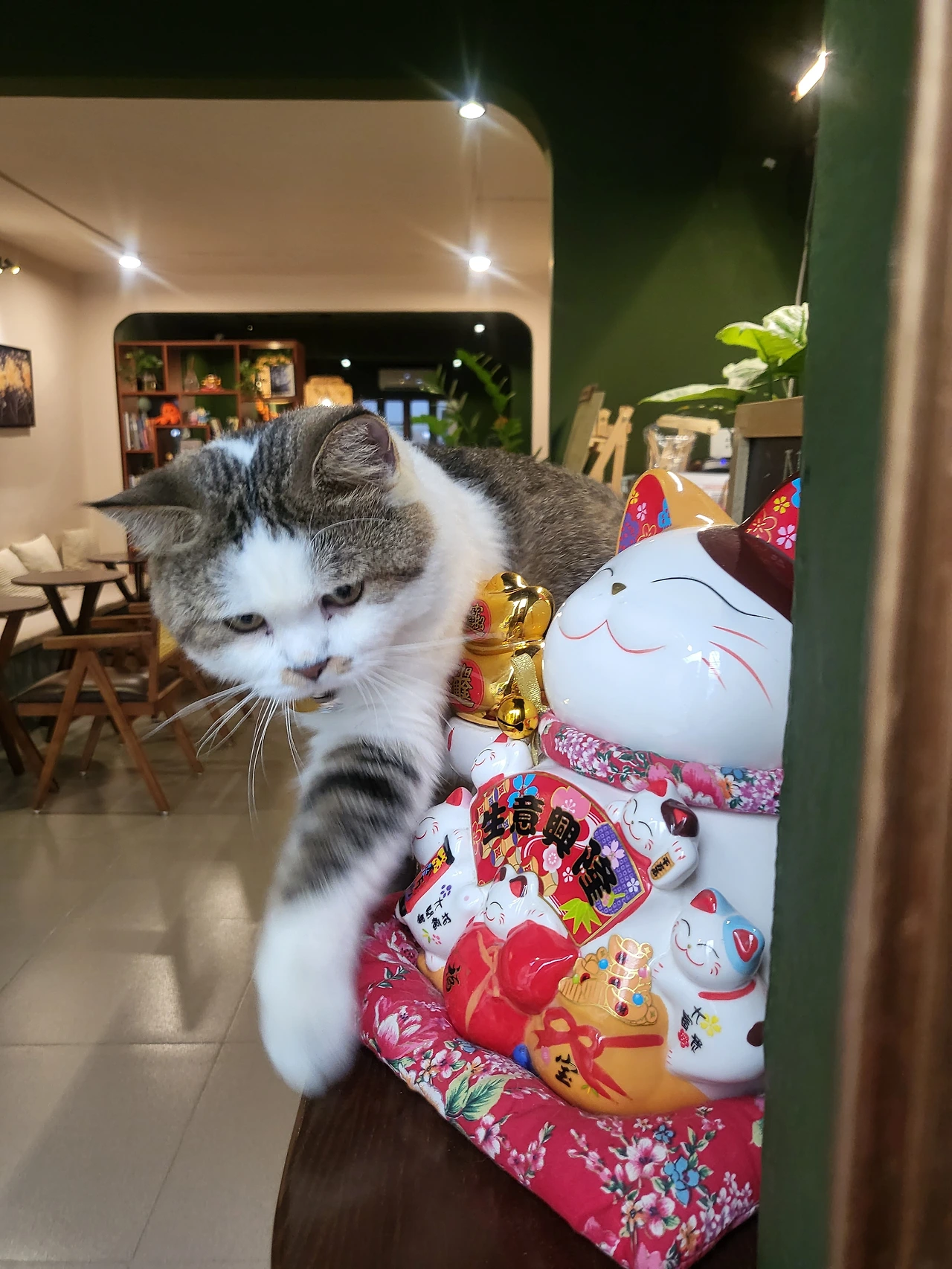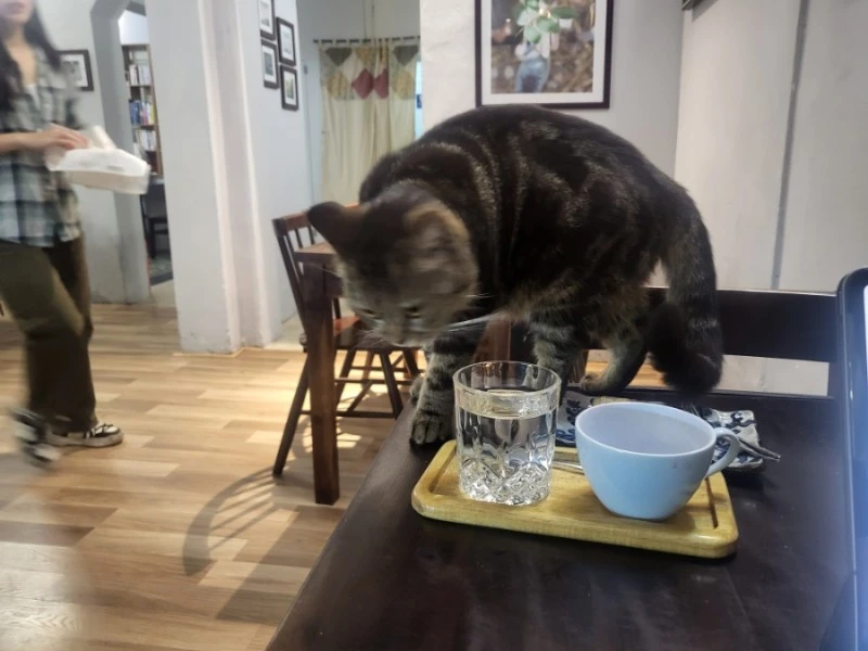 갑작스러운 냥이의 습격! 허기는 누구를 위해 울리나, 너도 배가 고프구나? 디저트를 탐한 건 엄마 고양이! 직원은 빛의 속도로 달려와 저지했다. 대담한 행동력을 보아 초범은 아닌가 보다. 눈 깜짝할 사이에 제압당하며 미수로 마무리된다. 직원은 멋쩍은 미소를 보이며 마미 캣에게 주의를 준다. 테이블이 삐걱댄 건 기분 탓이 아니었다. 알고 보니 식단 관리가 필요하다나. 함께 헬스 가자, 마미 캣!
