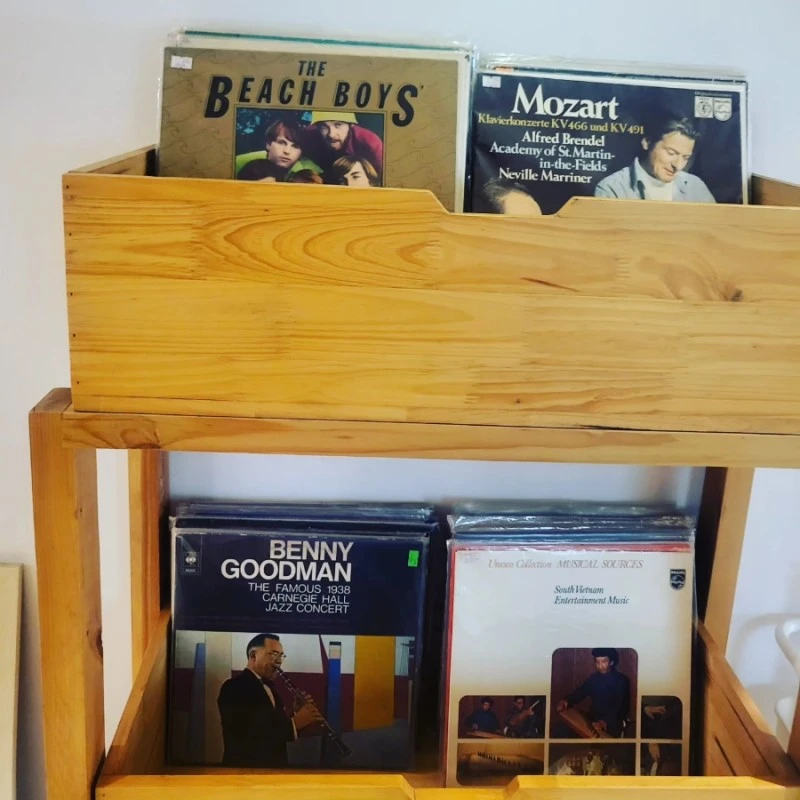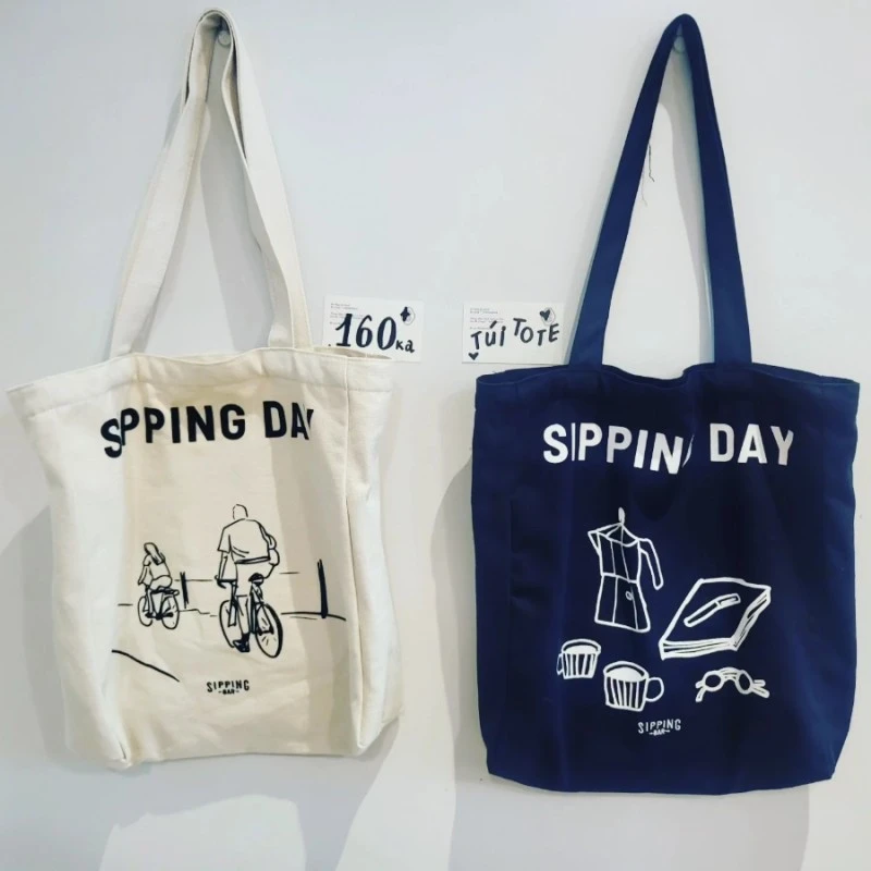 하노이 로컬 카페의 착한 가격은 이제 두말하기도 싫다. 그저 은혜롭기만 한 가격에 함성만 지를 뿐! 50 케이에서 비싸도 70 케이로 한화 2500 원이면 가능하니깐요. 2000 원에서 3000 원대의 커피는 하노이 리미티드 행복이지. 주문을 하고 돌아본다. 벽에 걸린 의외로 귀여운 ‘에코 백’은 무엇? 무뚝뚝 바리스타의 이미지와 상반되는 굿즈에 반전 매력을 느끼고야 만 한국인! 결국 네이비 하나, 아이보리 하나 깔별로 사고야 말았다. 에코백은 못 참지! 160 케이, 8천 원으로 작은 주머니까지 있다. 알러빗! 데일리 백으로 거의 매일 드는 중이다. (친언니와 하나씩 사이좋게 나눠 쓰는 중) 카운터 뒤쪽은 한번 앉으면 엉덩이를 뗄 수 없을 마력의 소파와 그 곁에 LP판과 취저 책들로 가득한 책장이 서있다. 용기 내어 앉아보고 싶지만 슈퍼 I형 인간에겐 너무 오픈되어 있군! 결국 2층으로 영차 영차! 계단을 타고 시원한 에어컨이 있는 작업실로 고 고!