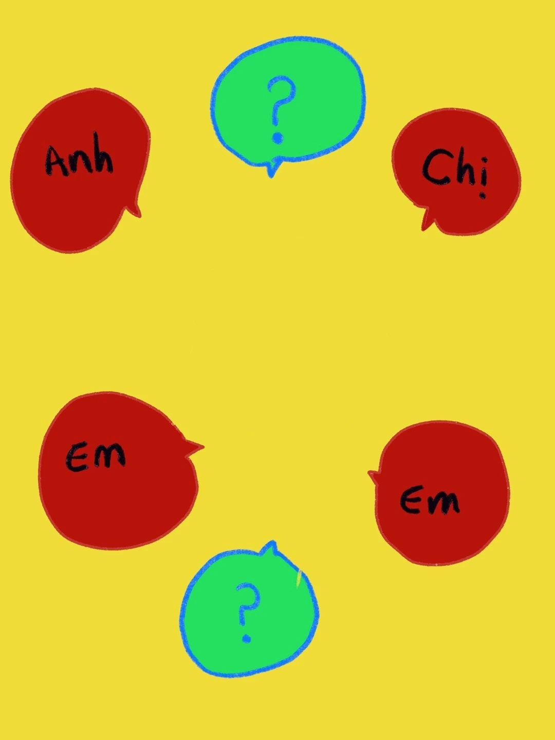 그냥 나이가 어려 보이면 여자든 남자든 ‘em ơi( 누구를 부를 때는 호칭에 ơi라고 붙인다.) 엠 어이’로 부르자. 그리고 많은 언니는 ‘chị 찌’ 오라버니로 보인다며 ‘anh 아잉’이다. 하지만 레스토랑이나 호텔 등 고객을 높여 부르는 말로도 ‘찌와 아잉’을 쓴다. 나이 지긋한 직원들이 본인을 ‘아잉과 찌’라고 부른다고 해도 괜히 내가 노안인가 하고 좌절할 필요는 없다. 누가 봐도 연상으로 보이는 호텔의 직원이 나를 ‘찌’라고 하는 순간 흠칫 놀란 적이 있는 일인이다.