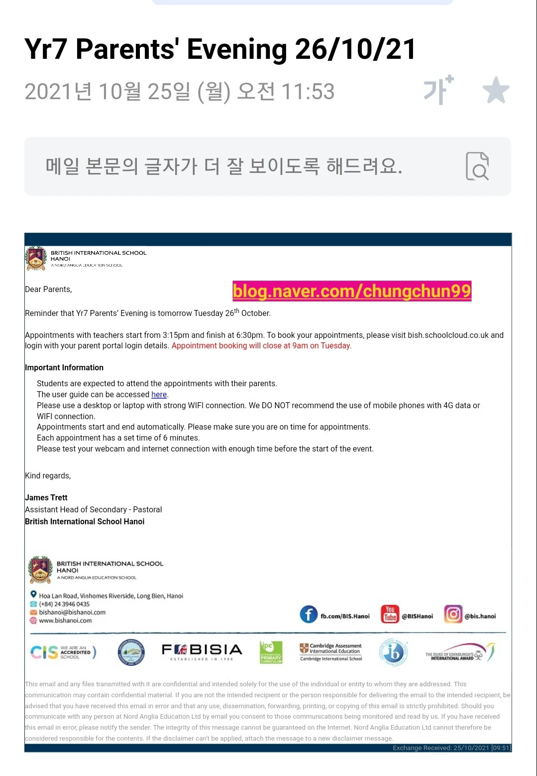 선생님들과의 약속을 잡으라는 이메일이다.