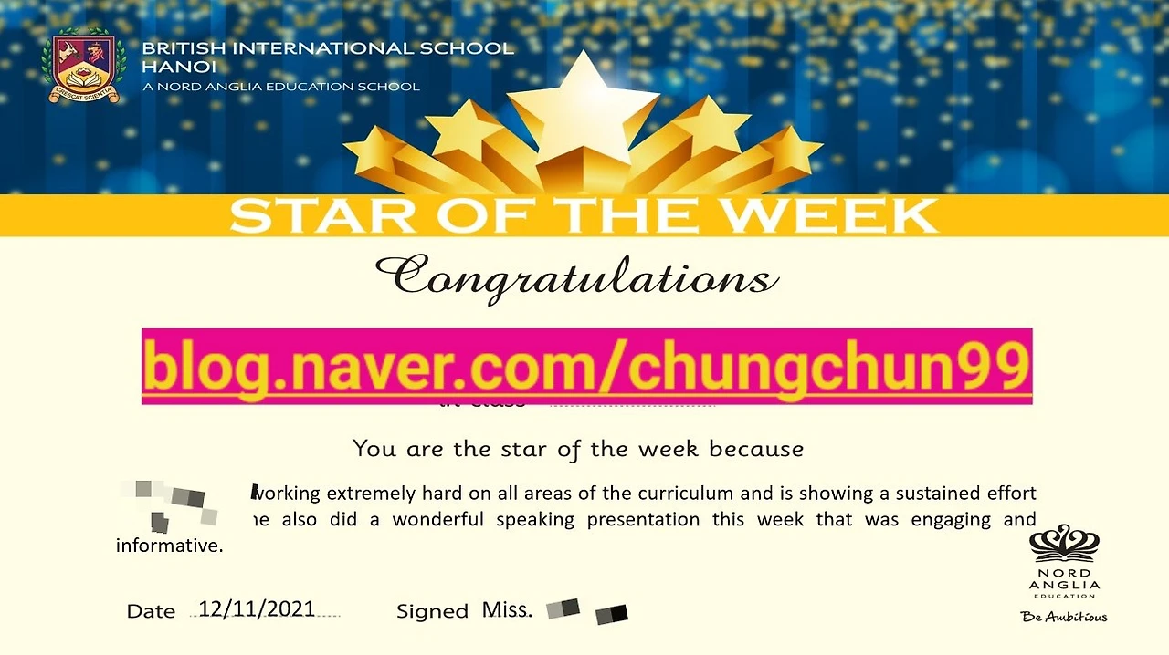 그리고 마침내, 지난주 금요일에 쩡이는 ‘Star of the Week’가 될 수 있었다. 텀(학기)마다 있는 프레젠테이션을 일주일 전부터 준비하고 열심히 외우던 쩡이였다. 그 노력이 드디어 빛을 보던 순간이었다. 상을 받아 세상을 다 얻은 듯 기뻐했다. 그리고 학교에서는자녀가 상을 받으면 학부모에게 메일을 보내는데, 쩡이는 내가 학교 메일을 받았는지 재차 확인을 했다. 우리 쩡이 아주 칭찬해!