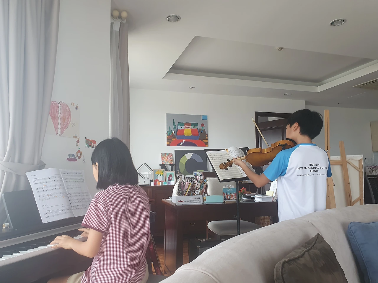 그리고 2주 차, 아이들이 수업을 받는 동안 서둘러 저녁 준비를 했다. 수업이 마치고 나오면 바로 먹을 수 있도록 식탁을 차렸다. 드디어 내 차례가 오자 얼른 앞치마를 벗고 손을 씻고 방으로 들어갔다. 2주 차에는 개방현을 키는 연습을 하기로 되어 있었기에 더 설레었다. 여전히 활을 쥐는 손은 부자연스럽기만 했다. 다행히 바이올린은 자리를 찾아가는 듯했지만 말이다. 그리고 대망의 개방 현인 A(라), E(미) 현 두 줄을 켜기 시작했다. 앗, 소리가 났다. 의외로 깔끔한 소리, 제법 그럴싸했다. 바이올린에서 울리는 소리와 진동이 고스란히 몸에 전해졌다. 국자만 쥐던 내가 활로 소리를 내고 있자니 황홀했다. 고작 개방현 두줄이었지만 말이다. 혼자 소리에 취해 있을 무렵, "Elbow."하고 선생님이 팔꿈치의 각도를 바로 잡아 주었다. 다시 팔에 온통 힘이 잔뜩 들어가기 시작했다. 순간 거울 속의 내 모습이 눈에 들어왔다. 흡사 관절마다 줄이 연결된 마리오네트 인형이었다. 선생님은 그런 내가 안쓰러웠는지 "Relax."라는 말을 반복했지만, 내 몸은 이미 말을 듣고 있지 않았다. 선생님은 '작은 별'의 악보를 보여주며, 우리의 목표는 이곡이라고 그때까지 도와주겠다고 했다. 하노이에 오길 정말 잘했다는 생각이 순간 들었다.