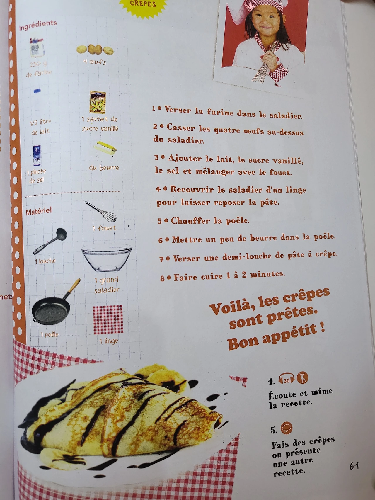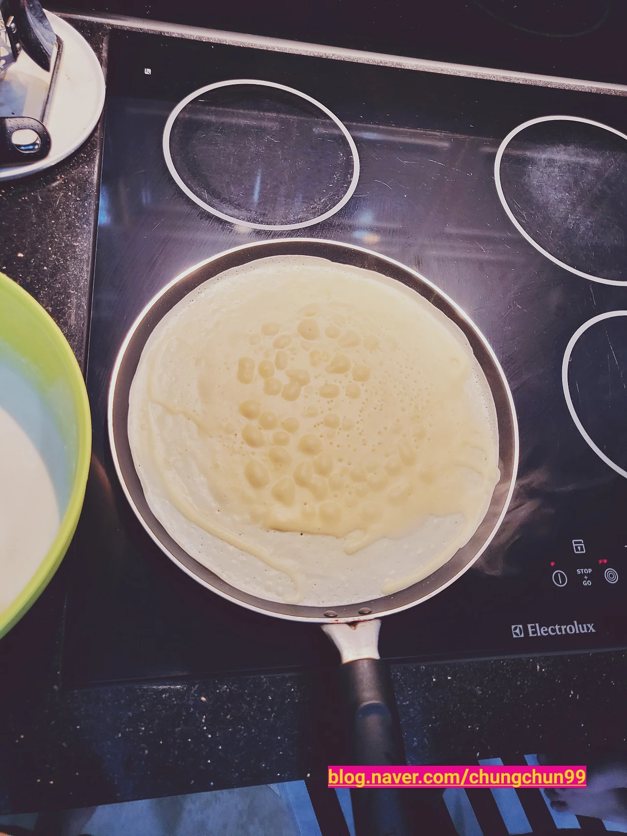 사라는 교재에 있는 액티비티로 나온 크레프를 보고 손수 모든 재료를 준비해왔다. 사실 손쉽게 할 수 있는 크리스마스 카드나 그림 액티비티도 함께 있었는데 말이다. 서프라이즈 이벤트를 준비한 그녀의 수고에 다시 한번 감동을 받았다. 그리고 갑분 쿠킹 수업이 시작되었다. 식탁에서 사라가 준비해온 계란을 돌아가면 깨뜨리기 시작했다. 그리고 저울에 밀가루와 우유를 붓는다. 반죽이 완성이 되자 수업 시간을 훨씬 지나고야 말았다. 슬슬 걱정이 되어 나도 모르게 시계를 흘깃거렸다. 그러자 사라는 사뭇 진지한 표정으로 말했다.