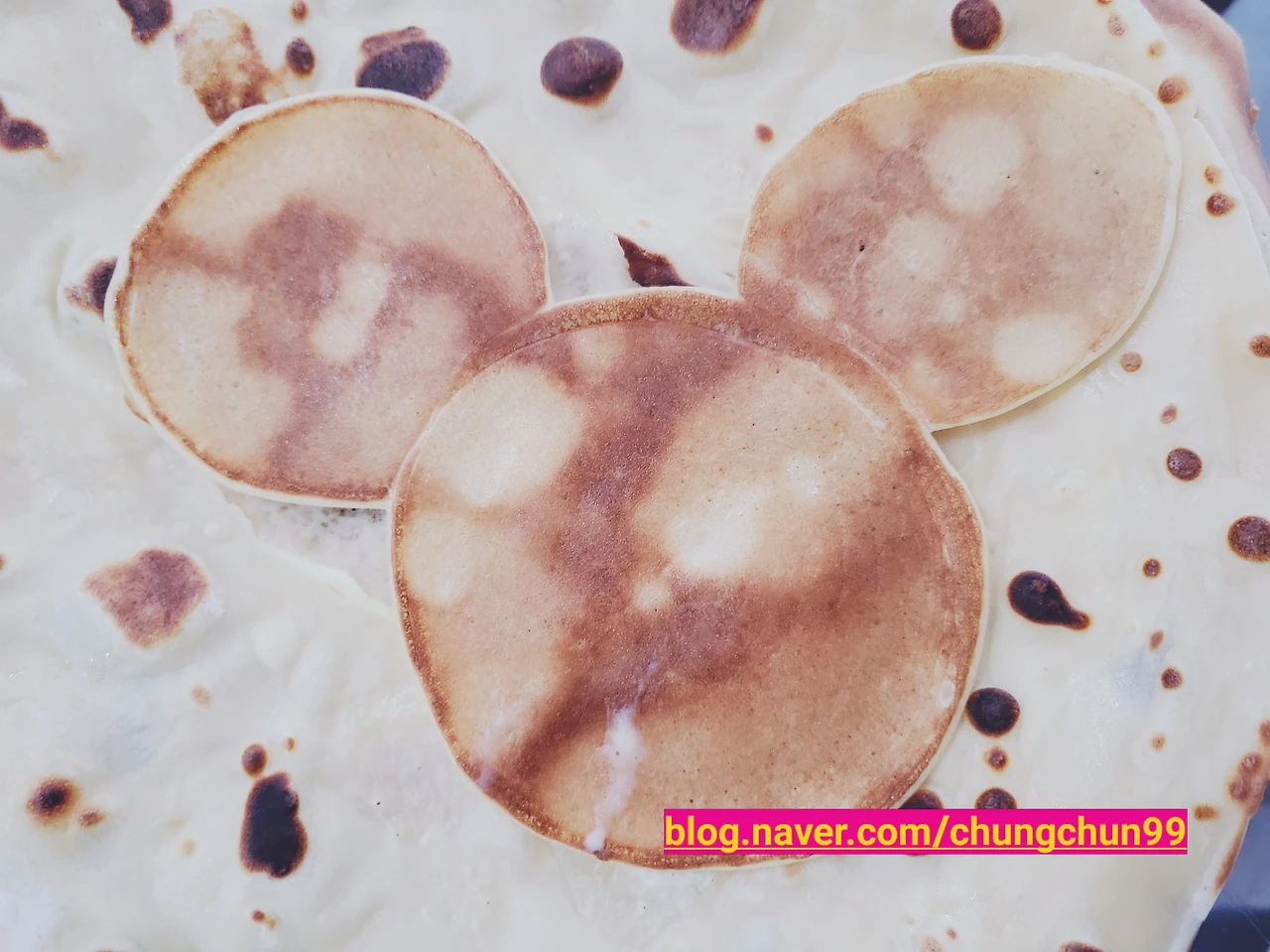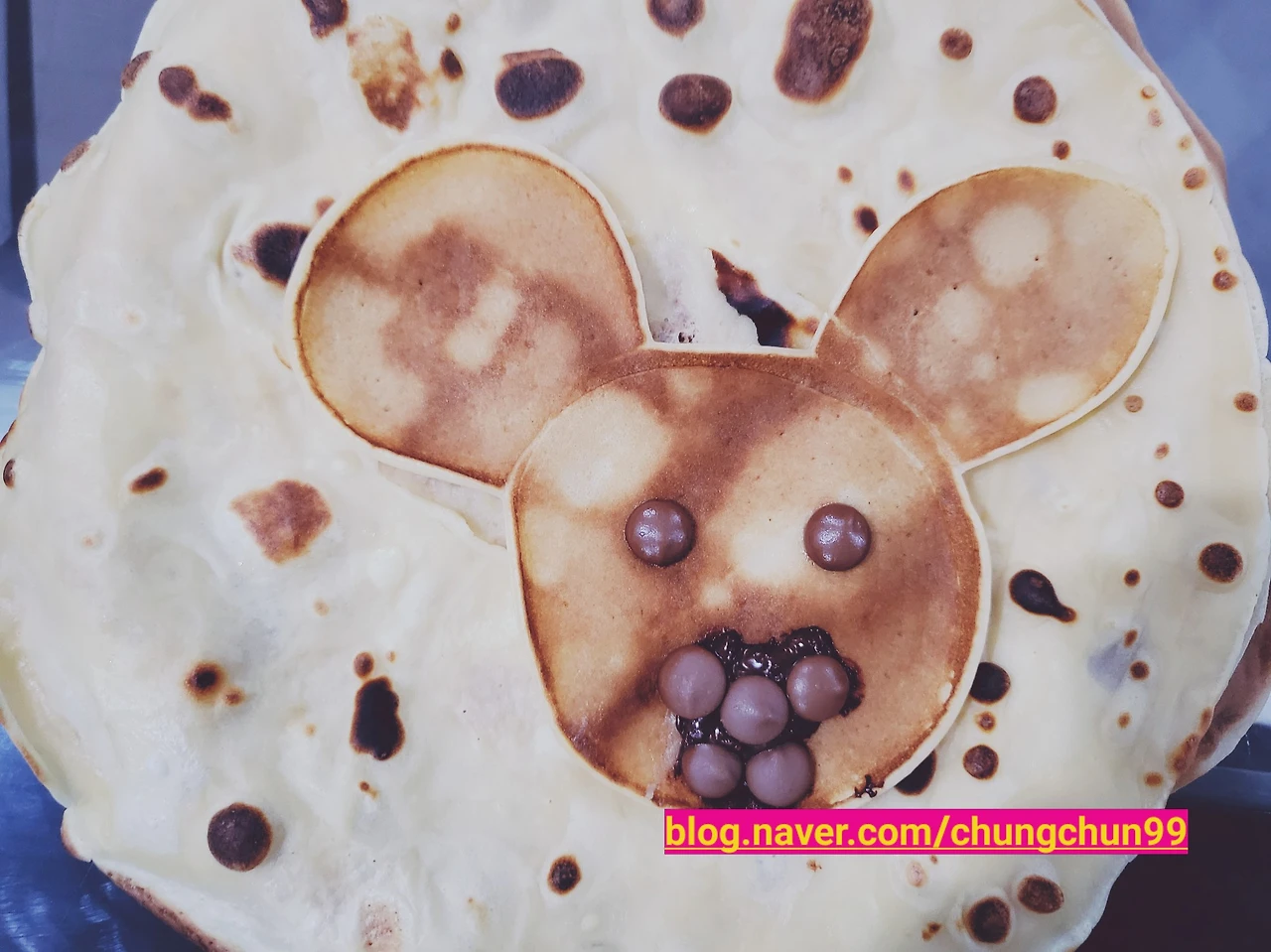 마지막에 남은 반죽의 양은 한 장을 굽기에는 애매한 양이었다. 하지만 마지막 남은 한 방울까지 모두 굽고 싶어 하던 쩡이에게 사라는 미키마우스를 굽자고 제안한다. 쩡이는 두 눈을 크게 뜨고 “미키 마우스?”라고 몇 번을 물어보았다. 쩡이는 제법 익숙해졌는지 스스로 냅킨에 녹인 버터를 묻히고 팬에 발랐다. 그리고 중간 크기의 동그라미 하나를 팬 가운데 퍼뜨리더니 다시 양쪽으로 작은 동그라미 두 개를 만들었다. 이윽고 현란한 사라의 손목 스냅! 똿!