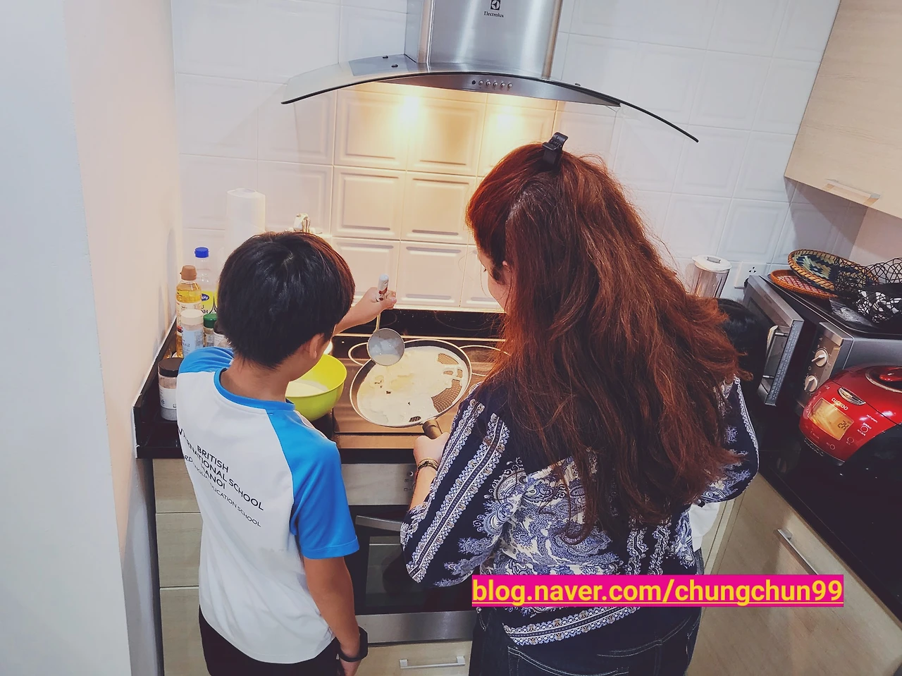 그냥 헤어지기 아쉬워 몇 번의 인사와 포옹을 나누며 그녀를 입구까지 배웅했다. 우린 사라져 가는 뒷모습을 향해 몇 번이고 인사를 외치고 손을 흔들었다. 그리고 집에 오자마자 쩡이는 올해 크리스마스에는 크레프를 굽자고 몇 번이고 말했다. 시종일관 모르쇠로 대응하는 엄마, 응~ 지키지 못할 약속은 하지 말자는 주의다. 기분에 휩쓸려 오케이를 했다가는 거짓말쟁이라는 돌이킬 수 없는 낙인이 찍히고야 만다. 쩡이는 결국 나를 불러 세우더니 자신이 요리법을 기억하고 있으니 또 굽자는 말을 야무지게 한다. 흔들림 없는 그 결연한 눈동자.. 크레프 요정은 그렇게 프렌치 숙제가 아닌 크레프 숙제를 내주고 홀연히 떠났다. 부디 안전하게 다녀오길~ 나는 하노이에 남아 손목 아대를 차고 열심히 팬을 흔들고 있겠소, 우리의 크레프 요정이여!