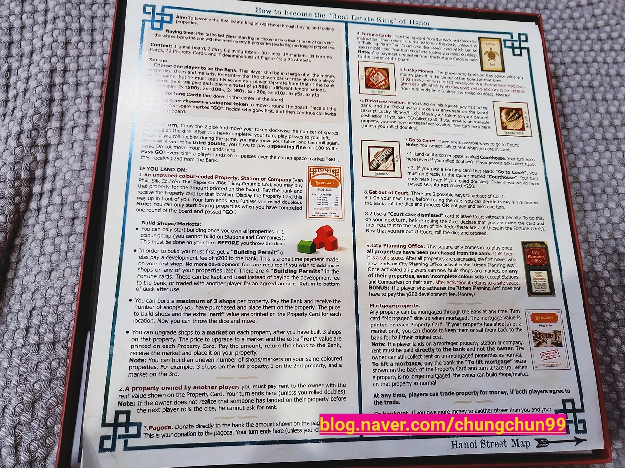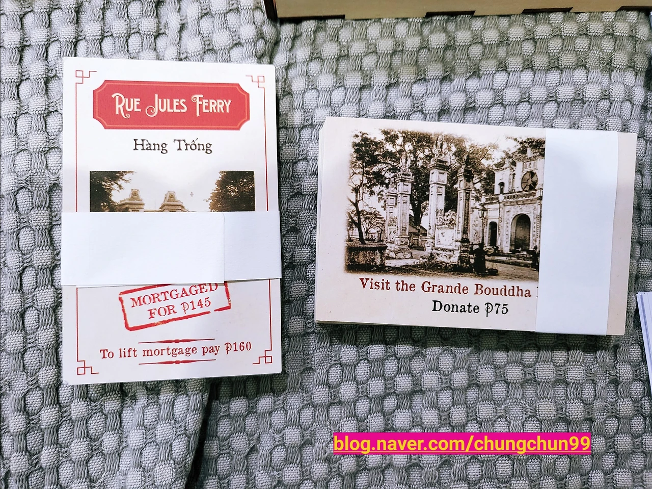 P.S. 하노이오폴리를 손에 넣는데 꾀 오랜 시간이 걸렸다. 사이공을 테마로 한 Saigon-opoly는 항상 재고가 있지만 하노이오폴리는 완판 되어 한동안 재입고가 되지 않고 있었다. 한 달을 넘게 재입고를 손꼽아 기다렸다. 컬렉티브 메모리라는 최애 선물가게에서 주문을 했는데, 처음에는 가격의 사악함에 주저한 것도 사실이다. 플라스틱 화폐도 아닌 종이로만 제작된 보드게임이 850,000 동(한화로 42500원)이라니.. 하지만 눈물을 머금고 샀다. 그러나 등잔 밑이 어둡다고 했던가. 일주일 뒤 10만 동이나 싸게(한화로 5천 원) 파는 가게를 집 앞에서 발견했다. 배송비까지 줘가며 산 나는 피눈물을 흘렸다. 컬렉티브 메모리가 다소 비싸다는 것은 알고 있었지만, 만 동도 아니고 10만 동이면 5천 원이다. Quánăn bình dân(꽌 안 빈전, 로컬의 저렴한 대중식당)에서는 쌀국수 '퍼' 두 그릇이 아닌가. 호떠이의 'BETTER WORLD HANOI'라는 가게에서 75만 동에 같은 제품이 판매되고 있으니 참고하길!