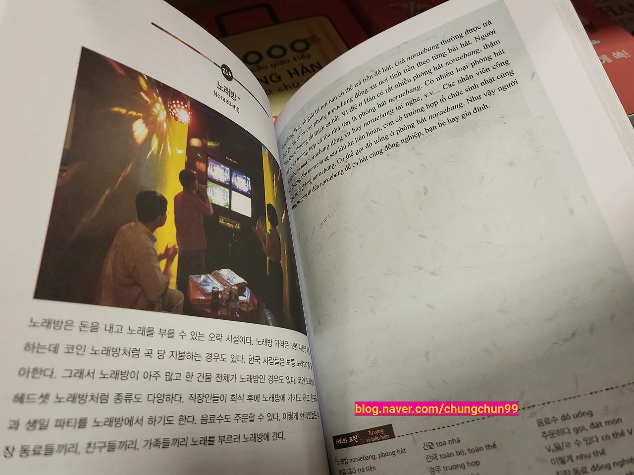 그리고 찾은 베트남의 로컬 서점, 영어책이라고는 하나 없는 백 프로 베트남 서적만 취급하는 곳이었다. 그리고 우연히 한국어 교재를 발견했다. 물론 이는 베트남 사람들을 위한 한국어 교재다. 베트남인들을 위한 한국어 책이라니.. 보다 보니 흥미로운 부분이 많다. 특히 문화 소개에 갑분 노래방은 무엇? 확실히 노래방으로 회식을 마무리하는 건 아주 자연스러운 흐름이긴 하지. 맥주와 안주를 흡입하고 칼로리 소모는 노래방의 막춤과 괴성으로 했던 과거의 나를 회상하게 하군요. 그리운 시절이여~