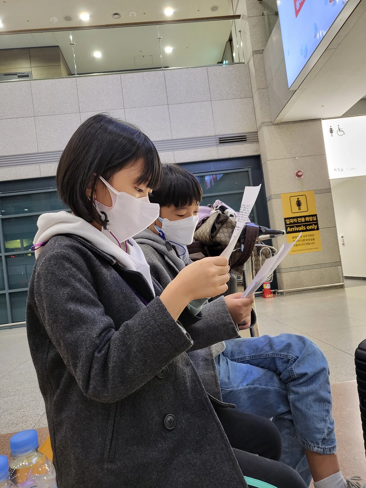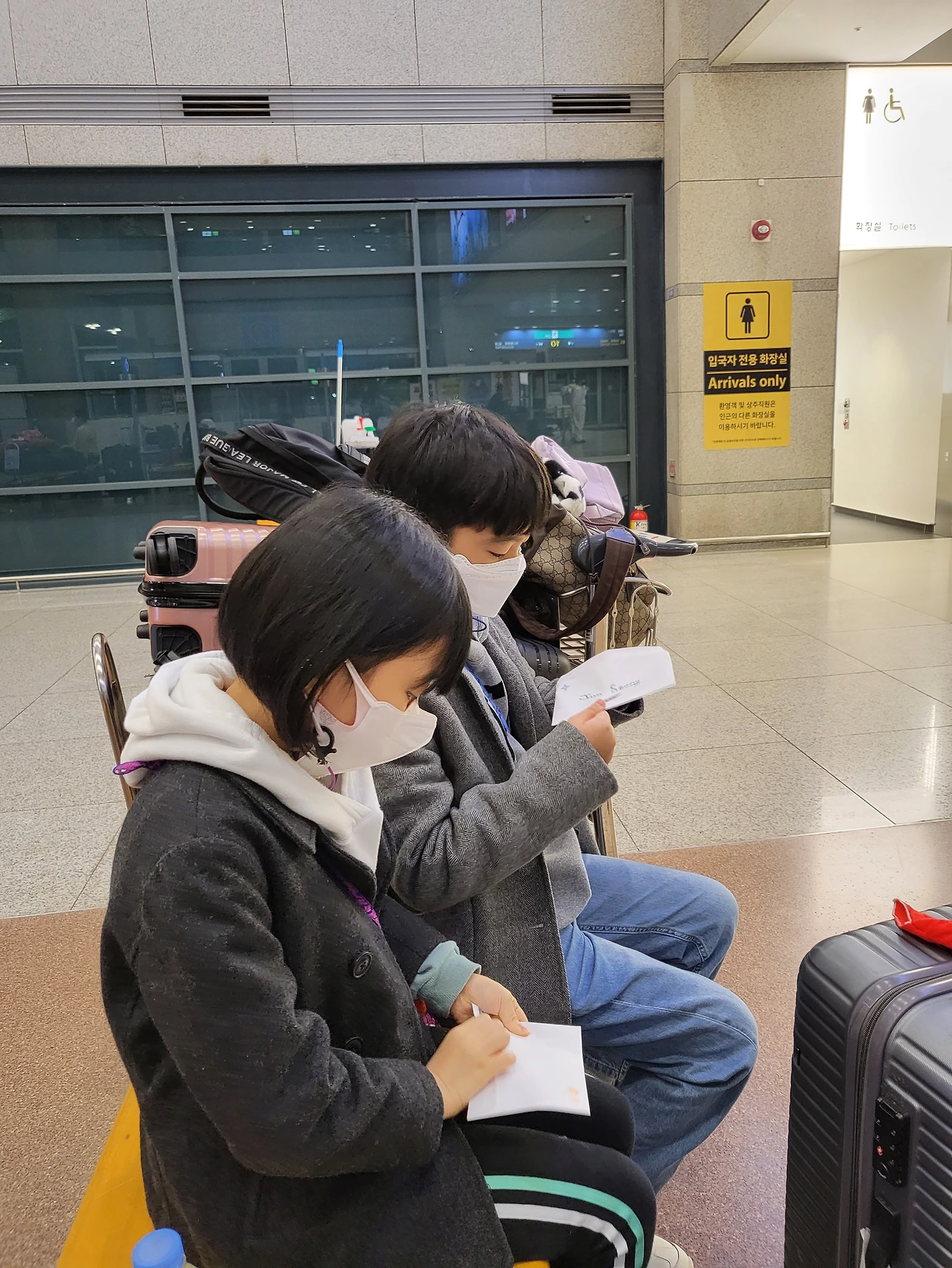이제는 누가 질문을 던지기만 해도 긴장하게 되었다. 또 뭔가 빠뜨린 건지, 체류할 주소 확인이 더 필요한 건 아닌지.. 백만 가지의 질문이 뇌를 헤집었다. 해외 입국자들은 광명역으로 가는 격리 버스를 타야 한다. 하지만 우리는 입국 심사의 지연으로 당초 예정되어 있던 버스를 놓치고야 말았다. 기나긴 기다림 끝에 겨우 다음 버스를 올라탈 수 있었다. 광명역으로 도착하자 으리으리한 규모에 입이 딱 벌어진 쩡이, 쭌이는 ‘우와~’ 하는 감탄사를 연발했고 나 또한 추운 바람에도 그저 신나기만 했다.