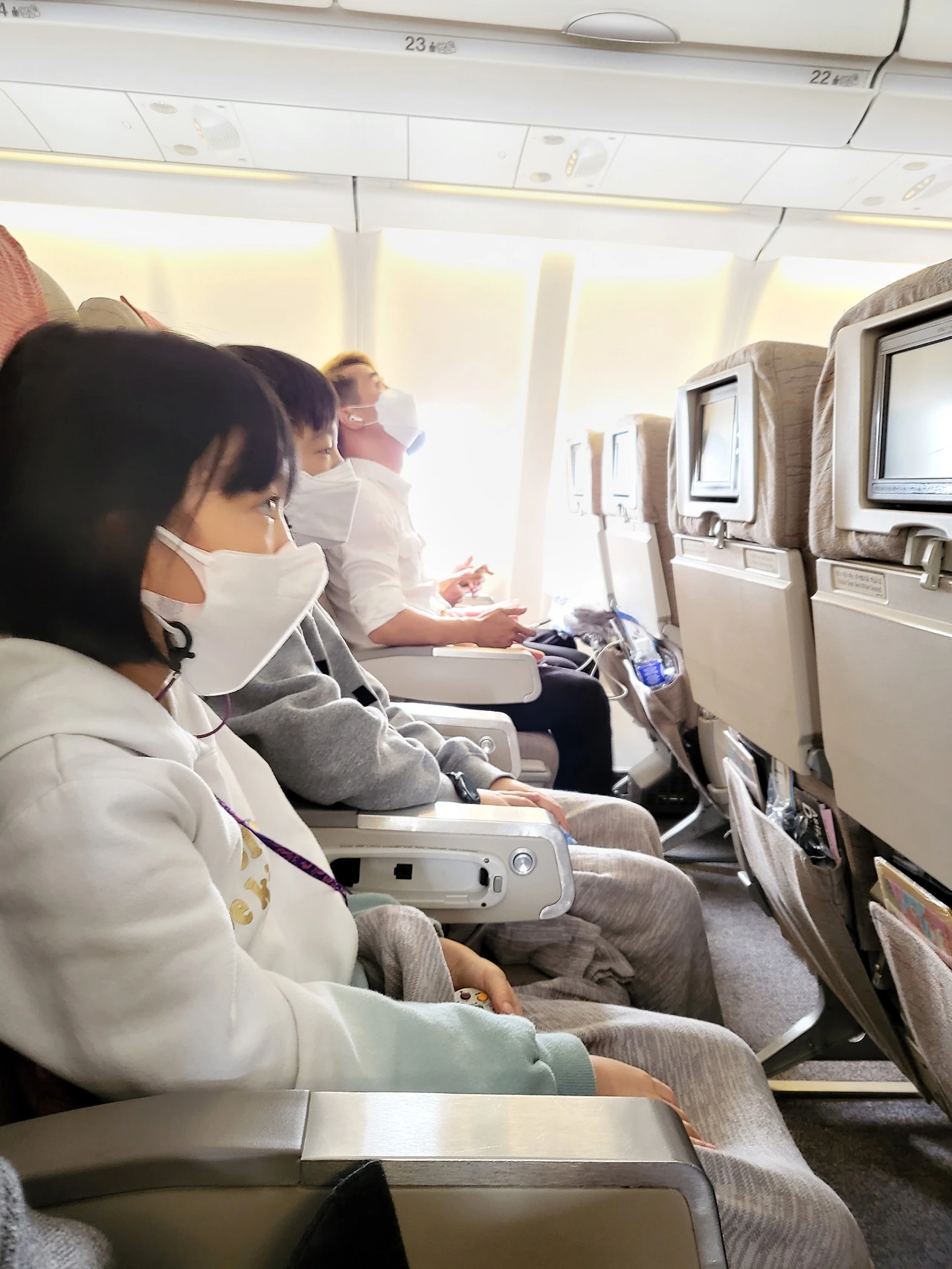 힘겹게 나와 기나긴 수색대를 빙글빙글 돌며 찾은 가방들을 끌며 게이트를 나섰다. 대학 입시 결과 발표보다도 더 가슴 저릿해지는 순간이었다. 하지만 하얀 방어복의 그들은 우리를 그냥 두지 않는다. 이제는 진짜 퐈이널리~ 공항에서 벗어나는 거라 환호했건만 흰 방어복 직원 두 명이 다시 다가왔다. 행선지를 묻더니 부산이라고 하자 아이들과 나의 어깨에 빨강 스티커를 척척 붙인다. 이건 뭐 1등급 한우 도장받는 느낌... 그렇게 다시 부산으로 가는 격리 열차역을 가기 위한 버스를 기다린다.