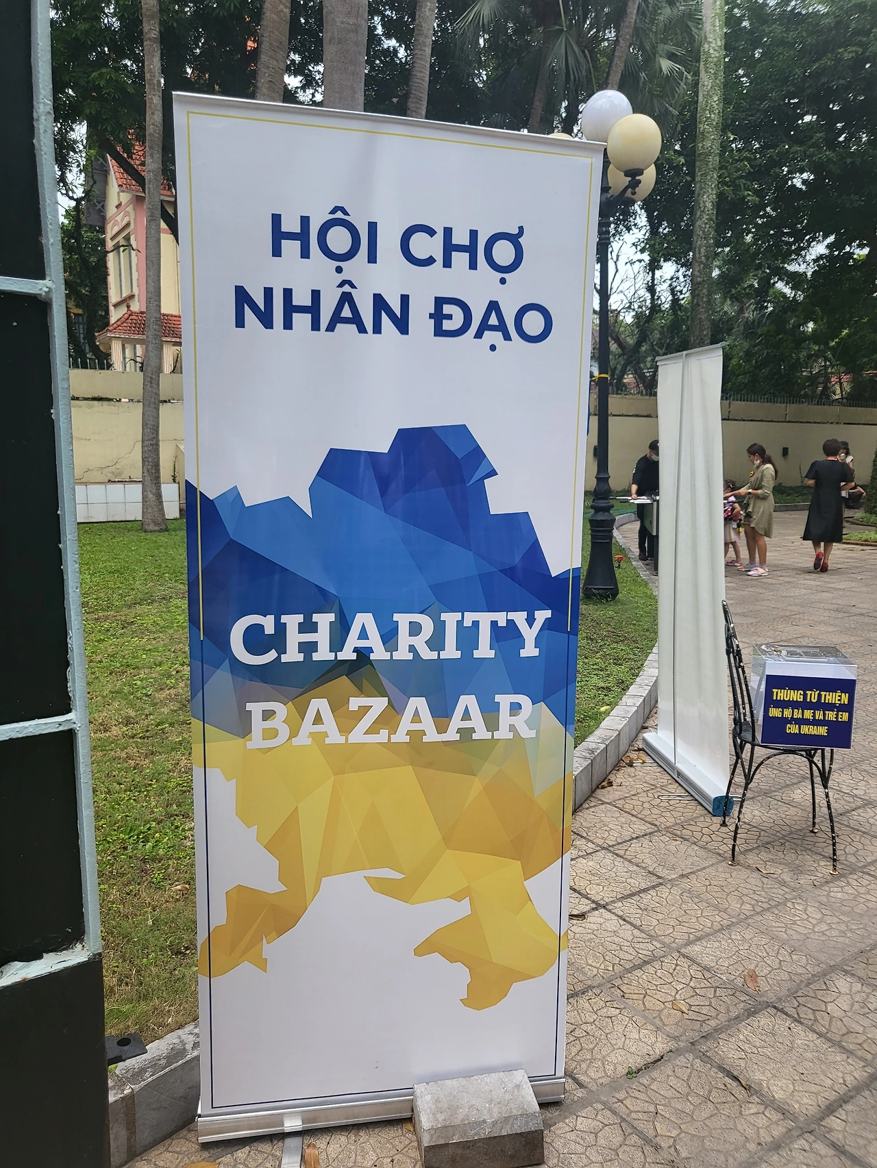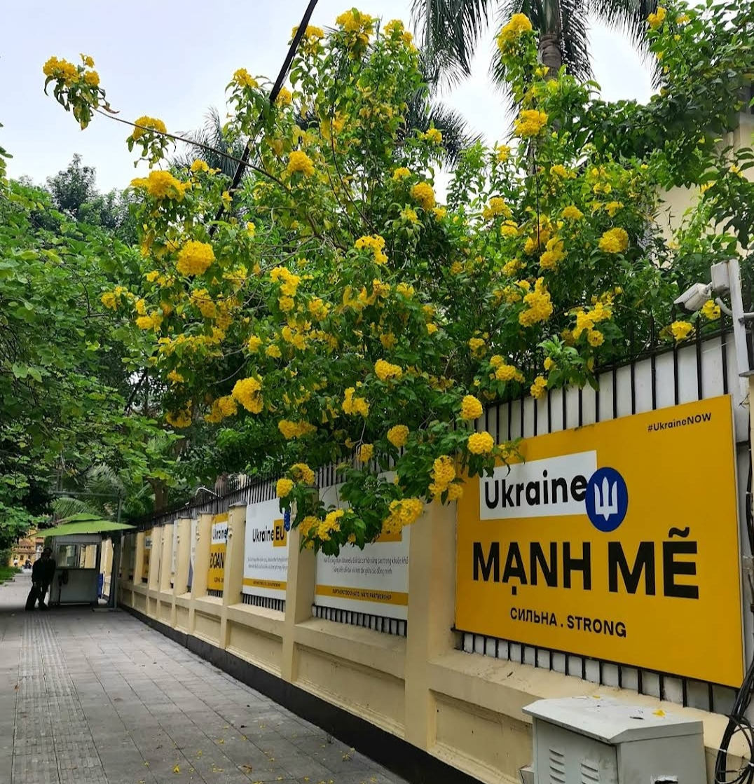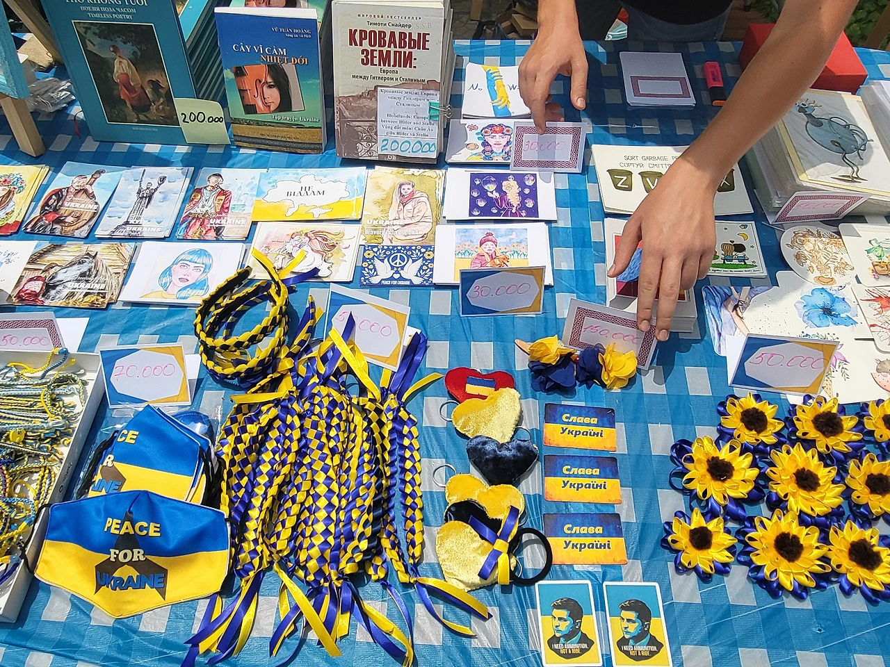 때마침 ㅁ은 페이스 북에서 접한 우크라이나 후원 바자회 소식을 공유해주었다. 읽고 바로 이거라는 느낌이 왔다. 아이들이 수업을 시작하자마자 부랴부랴 가방을 싸서 출발했다. 바딘에 있는 체코 대사관으로 말이다. 알고 보니 체코 대사관은 우크라이나 대사관과 매우 가까운 곳에 위치하고 있었다. 지금 우크라이나 대사관은 건물 벽면 전체가 우크라이나를 지지하는 베트남어와 노란 표어로 가득하다. 만일 바딘 광장 방향으로 간다면 한눈에 알아볼 수 있다.