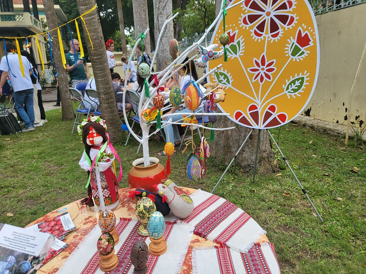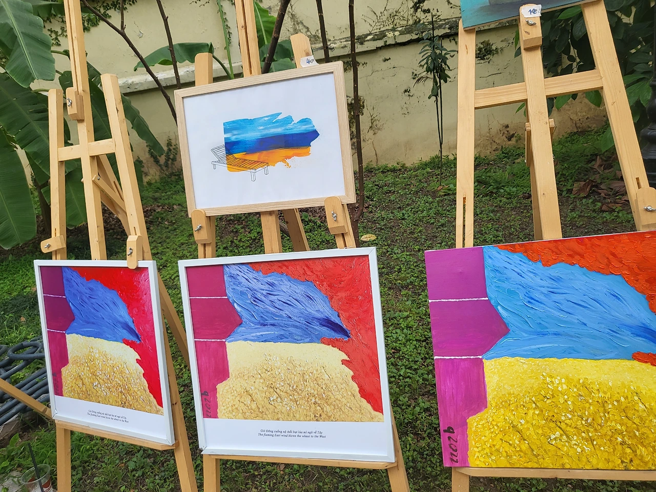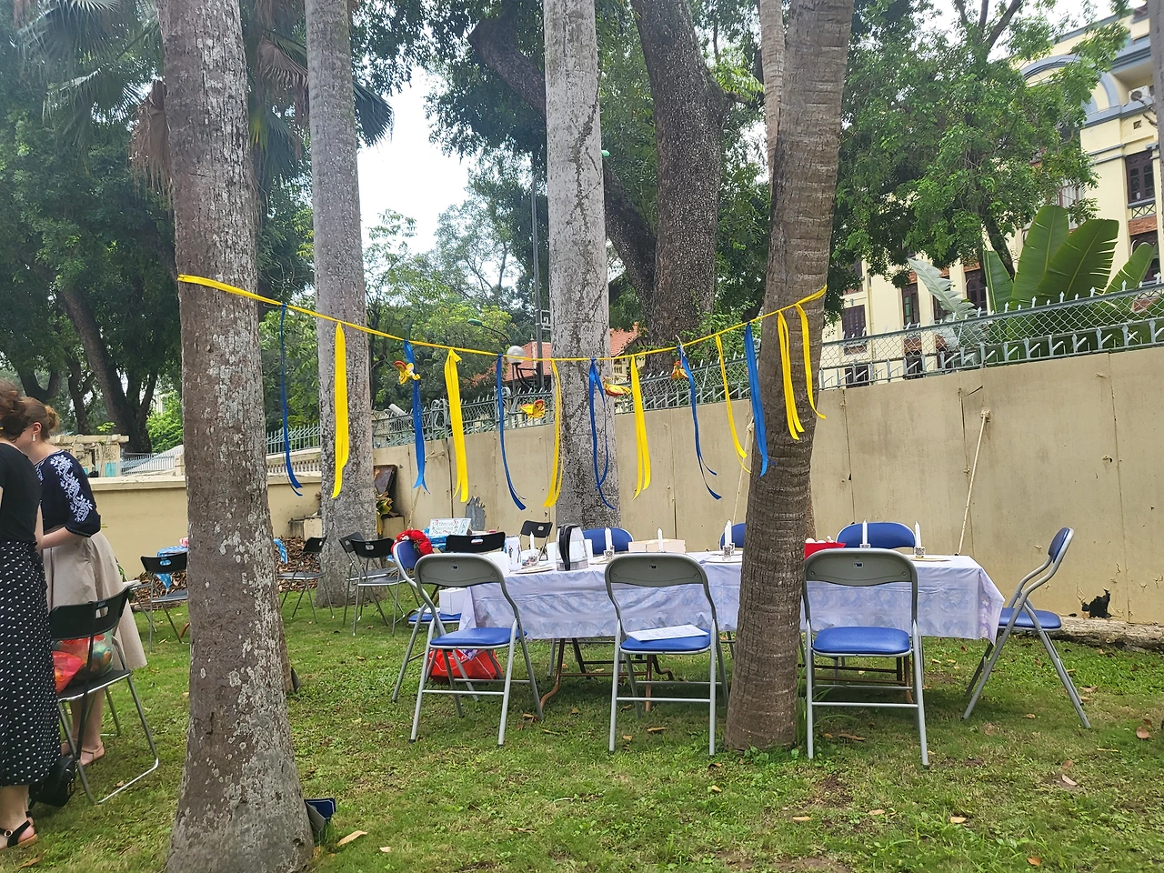 때마침 ㅁ은 페이스 북에서 접한 우크라이나 후원 바자회 소식을 공유해주었다. 읽고 바로 이거라는 느낌이 왔다. 아이들이 수업을 시작하자마자 부랴부랴 가방을 싸서 출발했다. 바딘에 있는 체코 대사관으로 말이다. 알고 보니 체코 대사관은 우크라이나 대사관과 매우 가까운 곳에 위치하고 있었다. 지금 우크라이나 대사관은 건물 벽면 전체가 우크라이나를 지지하는 베트남어와 노란 표어로 가득하다. 만일 바딘 광장 방향으로 간다면 한눈에 알아볼 수 있다.
