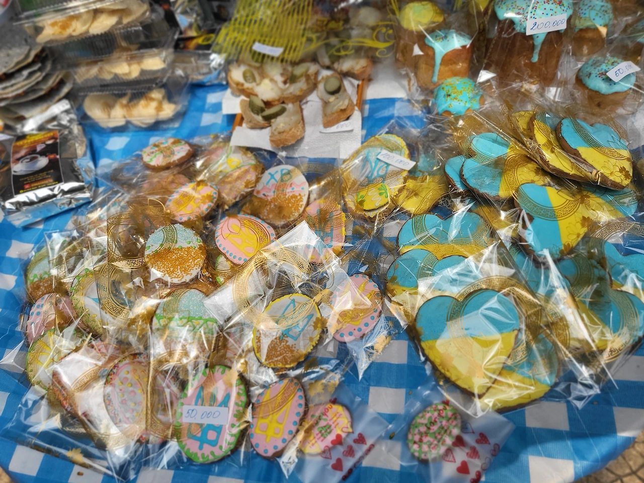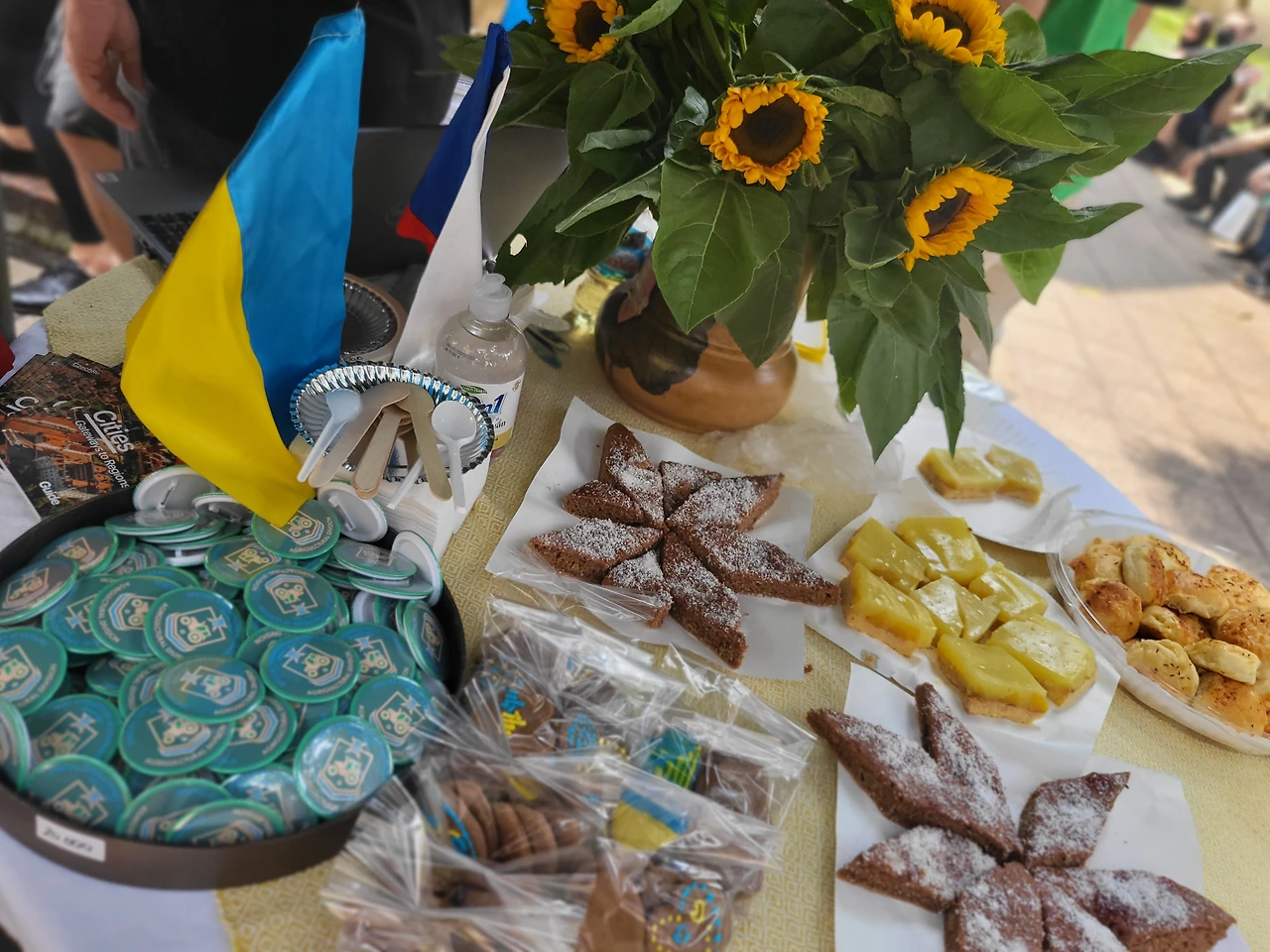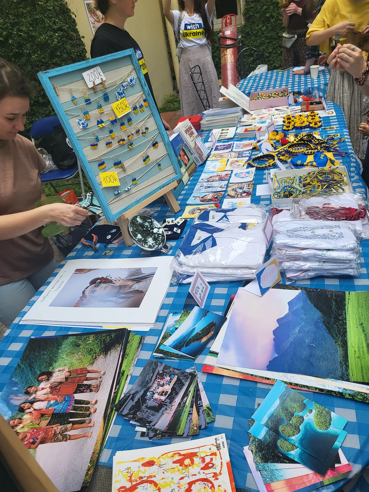 쨍한 블루와 따뜻한 옐로는 우크라이나의 국기다. 많은 상품들이 두 가지 색상으로 구성되어 판매되고 있었다. 젤렌스키 대통령의 사진은 물론 우크라이나 관련 서적이나 그림들이 흥미롭다. 멀게만 느껴졌던 세상이 한 층 더 가까이 느껴지는 순간이다. 행사에서 판매된 대부분의 아이템은 핸드메이드로 한 땀 한 땀 누군가의 피, 땀, 눈물이 강한 염원을 담고 태어난 것들 이리라. 가판대를 서성이다 결국 꽃무늬 와펜을 2개 손에 쥐고 왔다. 고작 5만 동이지만 도움이 되었길 빌며 말이다. (한화로 2천5백 원) 작은 규모의 바자 행사였지만 그 뜻은 깊고 크다. 코로나의 긴장감이 풀리고 이런 행사가 가능해진 것이다. 곳곳에서 커피와 소시지 그리고 우크라이나 디저트가 판매되고 있었다. 우크라이나 현지의 레시피로 만들어진 케이크 한 조각과 견과류가 든 초콜릿 케이크를 테이크 아웃했고 말이다. 같이 갔던 ㅁ도 전통 케이크 두 조각을 샀다.