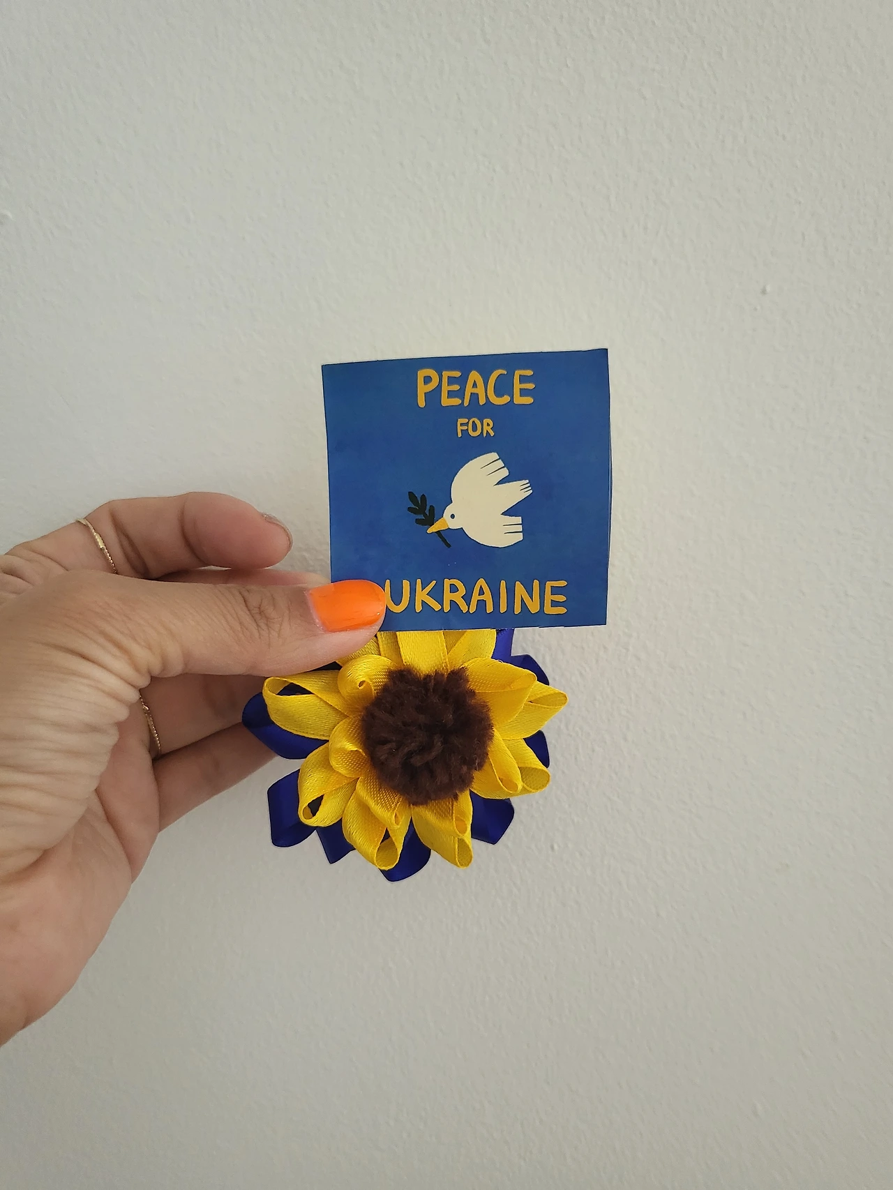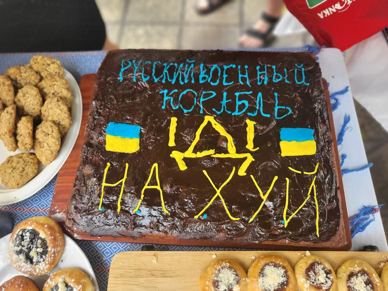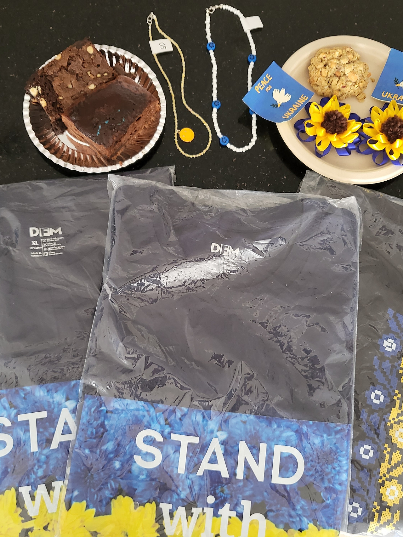 쨍한 블루와 따뜻한 옐로는 우크라이나의 국기다. 많은 상품들이 두 가지 색상으로 구성되어 판매되고 있었다. 젤렌스키 대통령의 사진은 물론 우크라이나 관련 서적이나 그림들이 흥미롭다. 멀게만 느껴졌던 세상이 한 층 더 가까이 느껴지는 순간이다. 행사에서 판매된 대부분의 아이템은 핸드메이드로 한 땀 한 땀 누군가의 피, 땀, 눈물이 강한 염원을 담고 태어난 것들 이리라. 가판대를 서성이다 결국 꽃무늬 와펜을 2개 손에 쥐고 왔다. 고작 5만 동이지만 도움이 되었길 빌며 말이다. (한화로 2천5백 원) 작은 규모의 바자 행사였지만 그 뜻은 깊고 크다. 코로나의 긴장감이 풀리고 이런 행사가 가능해진 것이다. 곳곳에서 커피와 소시지 그리고 우크라이나 디저트가 판매되고 있었다. 우크라이나 현지의 레시피로 만들어진 케이크 한 조각과 견과류가 든 초콜릿 케이크를 테이크 아웃했고 말이다. 같이 갔던 ㅁ도 전통 케이크 두 조각을 샀다.