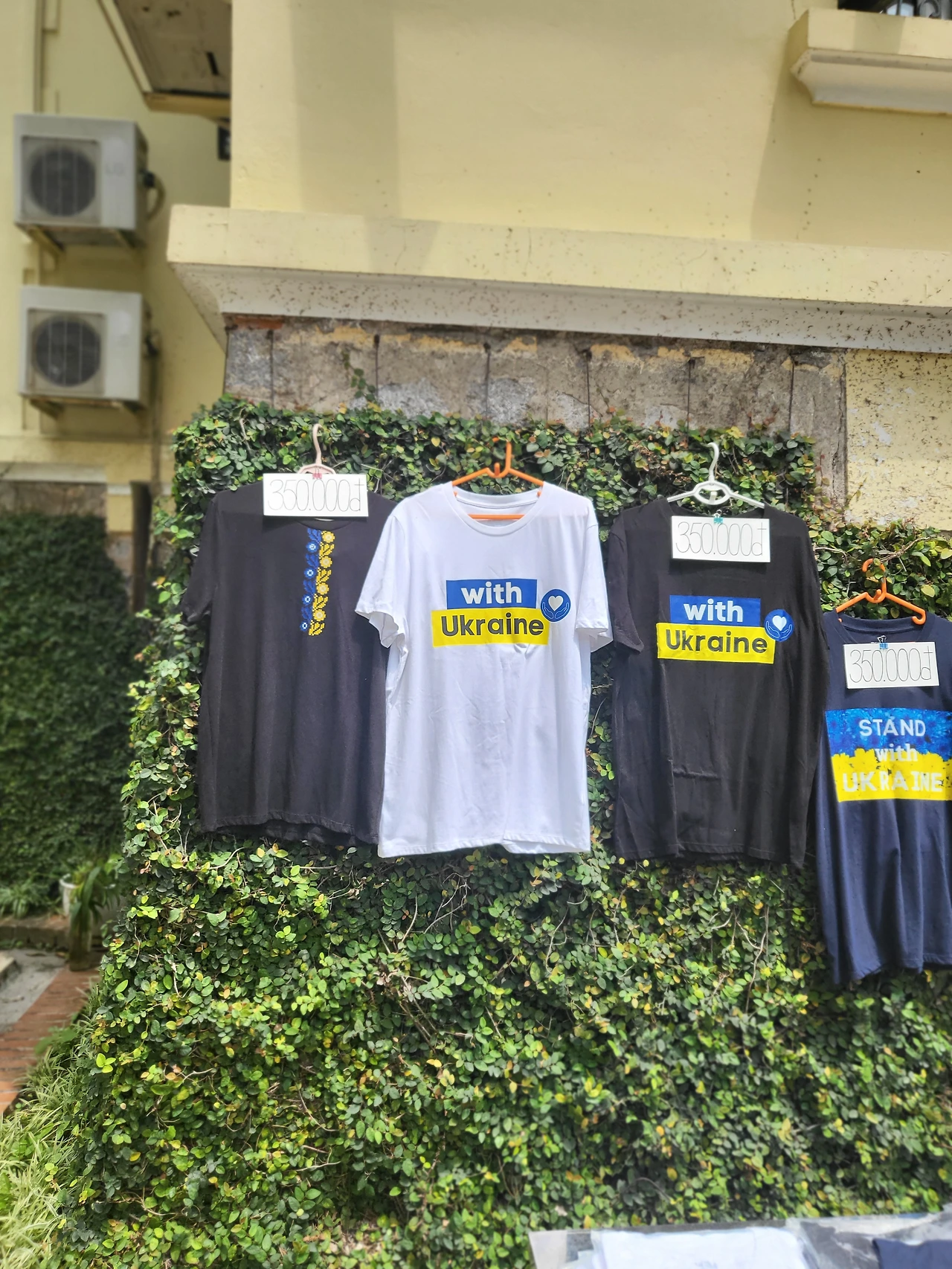 카메라를 들고 사진을 한창 찍어대도 되는지, 이렇게 관광객처럼 행동해도 될지 잠시 헷갈리기도 했다. 하지만 선글라스에 색색깔의 치마로 한껏 드레스 업 한 베트남 어머님들이 보이자 마음이 조금은 가벼워졌다. 여섯 명의 마담들이 엇비스듬하게 일렬횡대로 줄을 선 채 사진 찍는 모습에 양심이 조금 구원받기도 했지만 말이다. 그렇게 뒷마당을 지나 코너를 돌아 나올 때쯤, 티셔츠들이 눈에 띄었다. 가족 단톡방에 사진을 올리니, 남편은 네이비로 부탁한다는 답을 해온다. ‘Stand with Ukraine’이라는 메시지가 담긴 녀석이군요. 그래 35만 동이 뭐 그리 아깝겠나? 조금이라도 보탬이 된다면 이쯤은 기꺼이 낼 수 있다. 쩡이의 사이즈를 사기에는 너무 컸다. 결국 쩡이의 몫은 화이트, 옐로 그리고 블루로 이뤄진 비즈 목걸이 두 개로 대신했다. 3장의 티셔츠를 사고 자리를 빠져나왔다. 꾀나 많은 이들이 티셔츠에 관심을 보이고 사고 있었다. 당장 그 자리에서 티셔츠를 바꿔 입고 내가 산 와펜을 꽂은 이들도 있었다. 이런 가슴 뜨거운 사람들을 보았나.