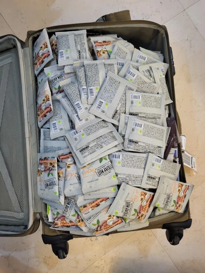 그리고 결과물은? 빠밤! 정체를 알 수 없는 룩의 선글라스가 방긋하고 앉아있었다. 막상 씌우고 보니 상상 속의 비주얼이 아닌가 보다. 남편은 허걱 숨을 멈춘다. 그리고 다른 가방을 열어보니! 악, 눈부셔!! 넛츠 러버 부인을 위해 견과류를 한가득... 이거 신종 맥임 수법입니꺄?!