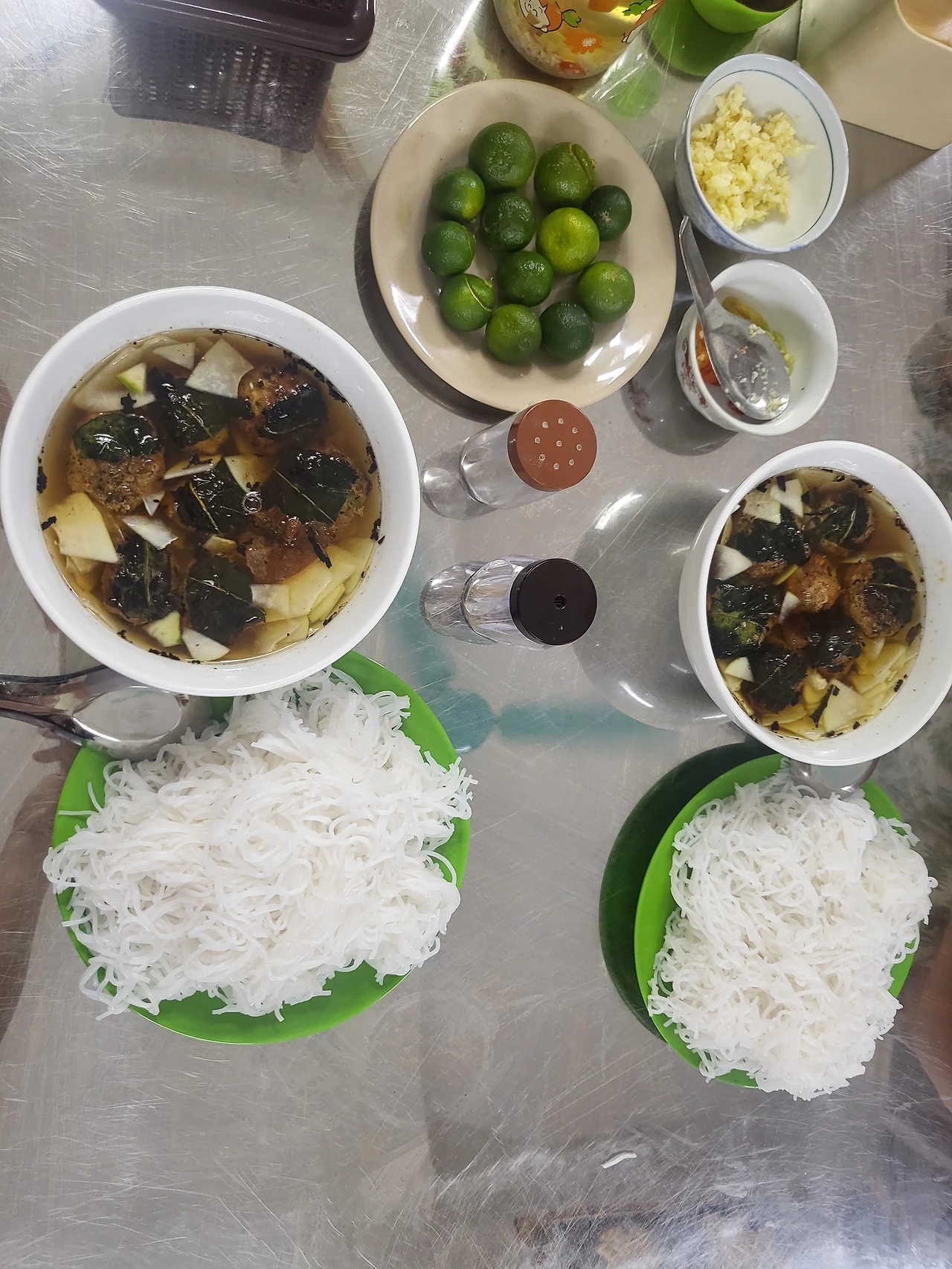 쇼 머스트 고 온! 이번에는 태국 사람이란다. 결국 정답 근처도 가지 못하고 더 멀리 겉돌게 생겼다. 이쯤 되면 스스로 정답을 오픈해야 한다. 두근두근 정답 오픈! 한국인이라는 답을 공개하자 아주머니는 몇 번을 ‘người Hàn?!’(한국인, 응어이 한)을 반복한다. 그렇게 쇼킹했단 말인가. 아주머니는 허를 찔린 듯 멍한 표정을 짓더니 빠르게 퇴장했다. T는 “찌(CHỊ 베트남어로 언니, 누나), 오프 좋아하니 잘됐네~ 태국인이라니..ㅋㅋ” 내가 태국 배우 ‘OFF JUMPOL’의 팬이란 걸 아는 그녀는 장난스럽게 놀렸다. 우리는 한바탕 크게 웃었고 마침 나온 분짜를 받아 식초를 넣고 후루룩 면치기를 시전했다.