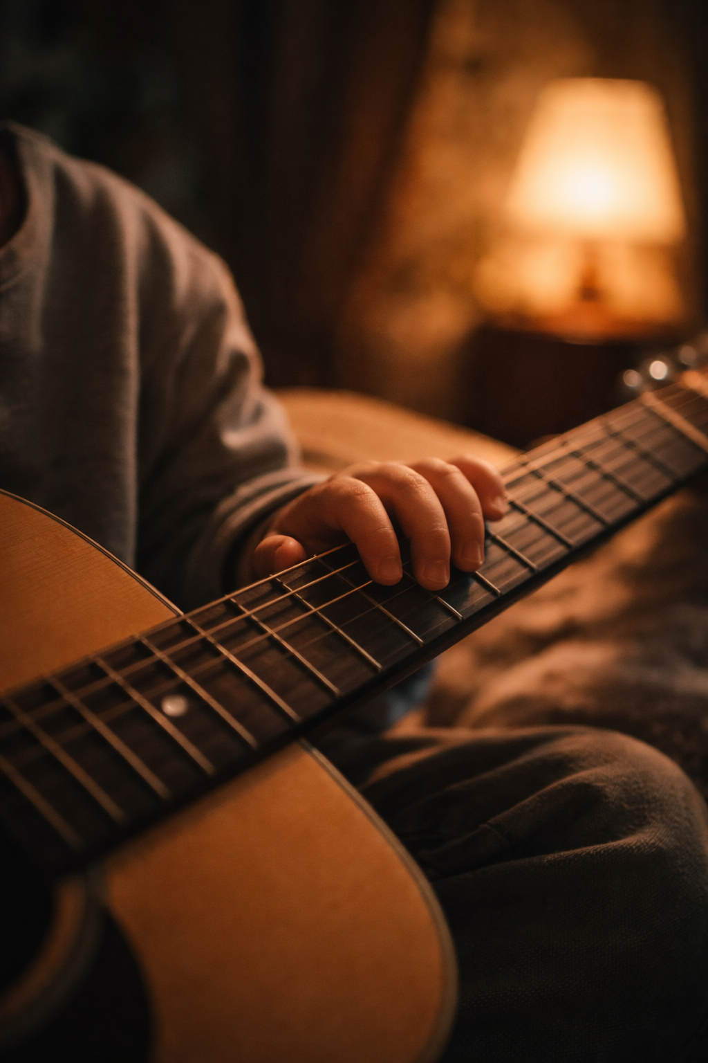 불이 꺼진 방에서 아이는 기타를 내려다본다.