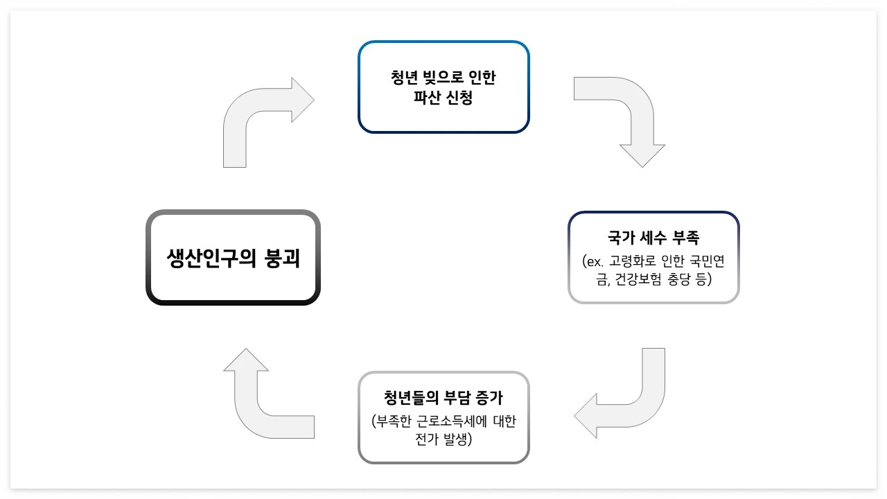저출산과 고령화라는 인구 문제가 대두되는 대한민국에서 청년들이 빚으로 인하여 무너지게 되는 것은 생산인구의 붕괴의 시작이다. 청년들의 채무로 자영업과 기업의 위기가 닥치고 생산인구의 붕괴까지 이어지는 나비효과가 발생한다면 이는 국가 존속의 위기를 의미한다. 단순하게 소비의 감소로 인한 현재 경기 침체를 넘어서 따라서, 정부에서도 가볍게 넘길 문제는 아니었을 것이라 생각한다.