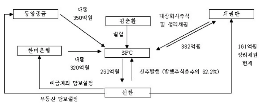 피고인은 건설회사 신한을 인수하고자 2001년 특수목적회사(SPC)를 설립하고 같은 해 동양종금과 한미은행으로부터 각각 350억, 320억 원을 차입하였다. 차입한 금액 중 260억 원은 신한이 발행하는 신주의 인수대금으로, 382억 원은 신한의 채권단인 보유하던 주식 및 정리채권의 인수대금으로 사용하였다. SPC가 신한의 대주주가 된 후 피고인은 2001년 신한의 대표이사로 선임되었고 동양종금에는 신한 소유 부동산과 한미은행에는 신한 예금계좌를 담보로 설정하여 주었다.