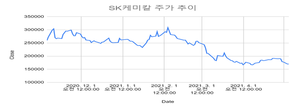LG화학과 SK케미칼은 물적분할을 통해 각각 LG에너지솔루션, SK바이오사이언스로 분할되었다. 그래서 GOOGLE FINANCE를 활용하여 물적분할 이후 신설 회사의 상장이 승인된 전후 3개월 동안의 주가를 그래프로 살펴볼 것이다. 따라서 LG화학의 경우 LG에너지솔루션의 상장이 승인된 2021년 12월 1일을 기점으로 전후 3개월, SK케미칼은 SK바이오사이언스의 상장이 승인된 2021년 2월 4일을 기점으로 전후 3개월의 주가를 살펴볼 것이다.
