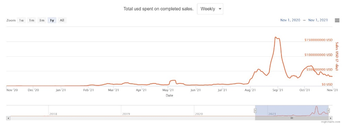 [그래프 1] 2020.11.01~2021.11.01 NFT 거래액 변화 (주간)[20]