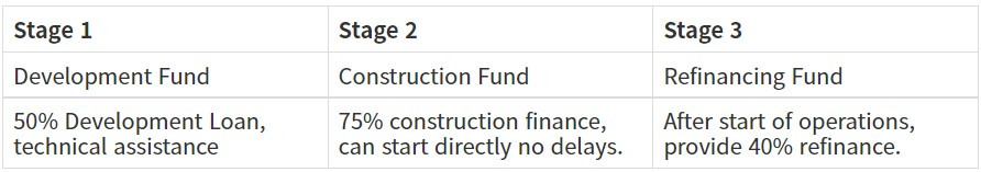 Stage 2에서는 시장에서 자금을 조달할 때 발생하는 비용의 75%로 자금을 제공받는다. 이는 아래의 3개의 단계(tier)로 구성된다. Construction Fund는 Development Fund나 Refinancing Fund와는 달리 공사비의 최대 75%를 지분투자 형식으로 제공하여 부채비율 개선에 기여할 수 있다. Construction Fund는 다음과 같이 조성된다. 민간은 후순위와 선순위에 투자하게 되는데 비교적 안정적인 수익률을 달성할 수 있다. 마지막으로 Stage 3에서는 Refinancing Fund를 제공한다.[32]