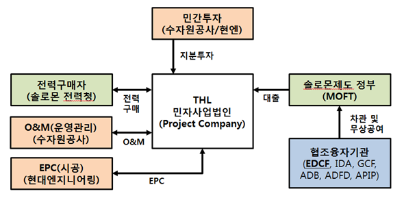 2019년 말 수출입은행의 보도자료에 따르면, ‘솔로몬 티나강 수력발전사업’은 솔로몬 제도의 수도인 호니아라 동남쪽 20km 인근에 수력발전소를 건설하여 관리하는 프로젝트로, 총 2억 4188만달러가 투입될 예정이었다. 이는 EDCF가 솔로몬제도에 PPP의 형태로 처음 투자한 사업으로서, 한국 기업이 사업 전반에 참여하는 ‘투자개발형 고부가가치사업’이었다. EDCF의 투자에 앞서 한국수자원공사와 현대엔지니어링은 민자사업법인(Project Company)인 THL(Tina Hydropower Limited)를 설립하고, 현대엔지니어링과 EPC(설계, 조달, 시공) 계약을 체결했다. EDCF는 해당 PPP 사업에 협조융자 방식으로 대출금(Debt Financing)을 지원했다. 규모는 3160만 달러였다. 그뿐만 아니라 세계은행(World Bank, 3300만 달러), 녹색기후기금(GCF, 8600만 달러), 아시아개발은행(ADB, 3000만 달러), 아부다비개발기금(1500만 달러), 호주-태평양도서국 파트너십펀드(1270만 달러)가 함께 협 조융자 사업에 참여했다. 구체적인 사업 진행 구조도는 다음과 같다.[25]