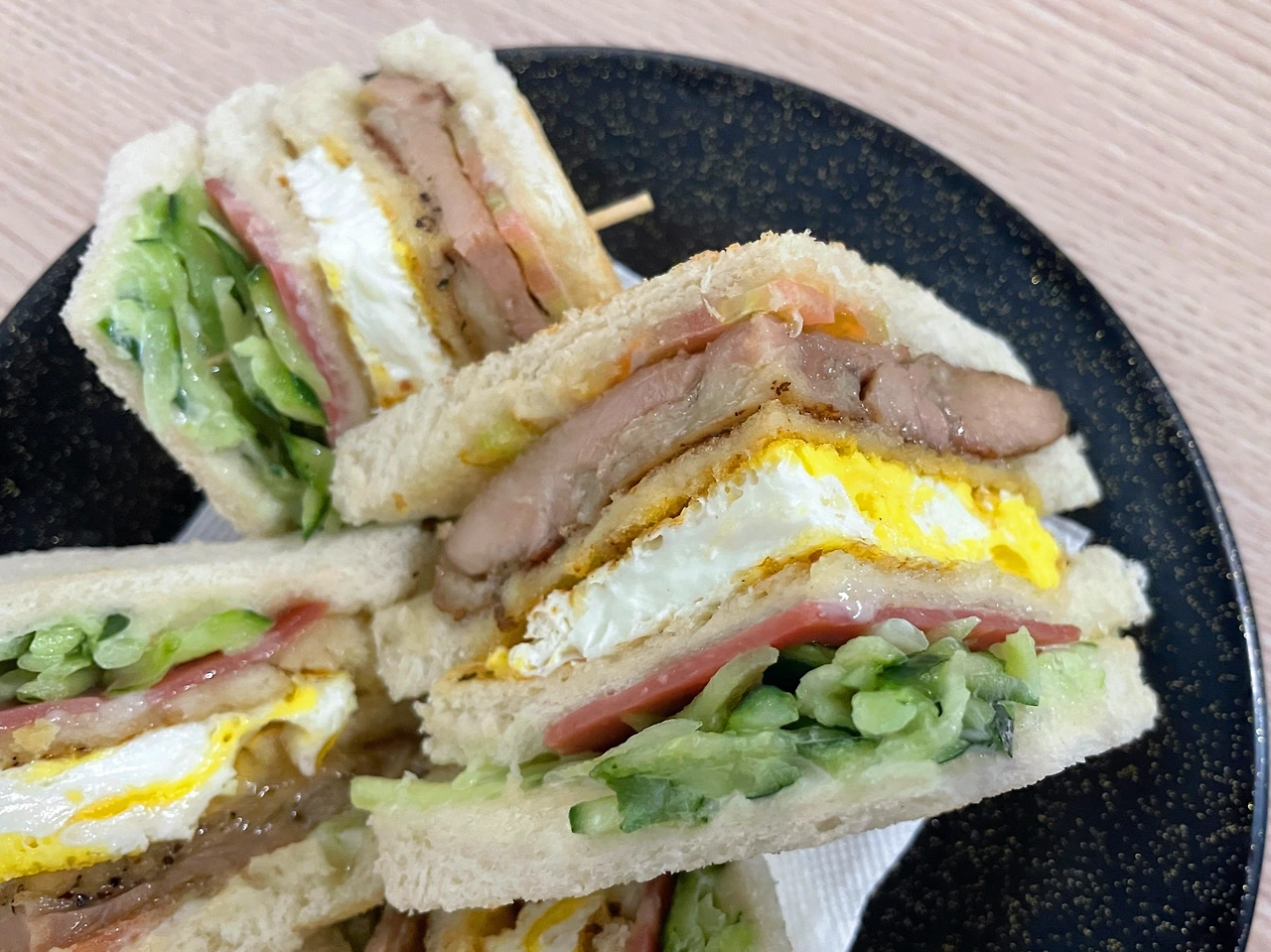 일반적으로 하얀 식빵 사이에 계란과 참치, 오이, 햄 등의 속재료를 넣어 먹는데,