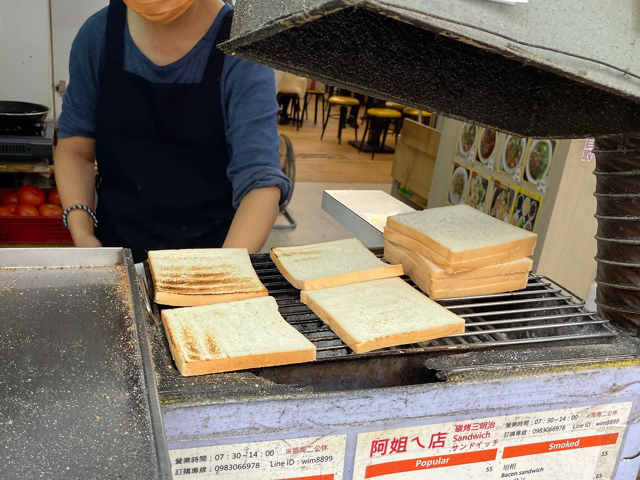 이곳은 숯불 샌드위치만 전문으로 파는 아침 식사 가게에요.
