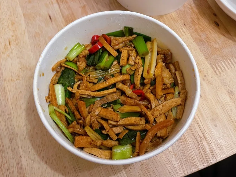 삼겹살과 건두부(豆乾), 말린 오징어, 샐러리, 파 등의 재료에 간장을 넣고 볶은 것으로,