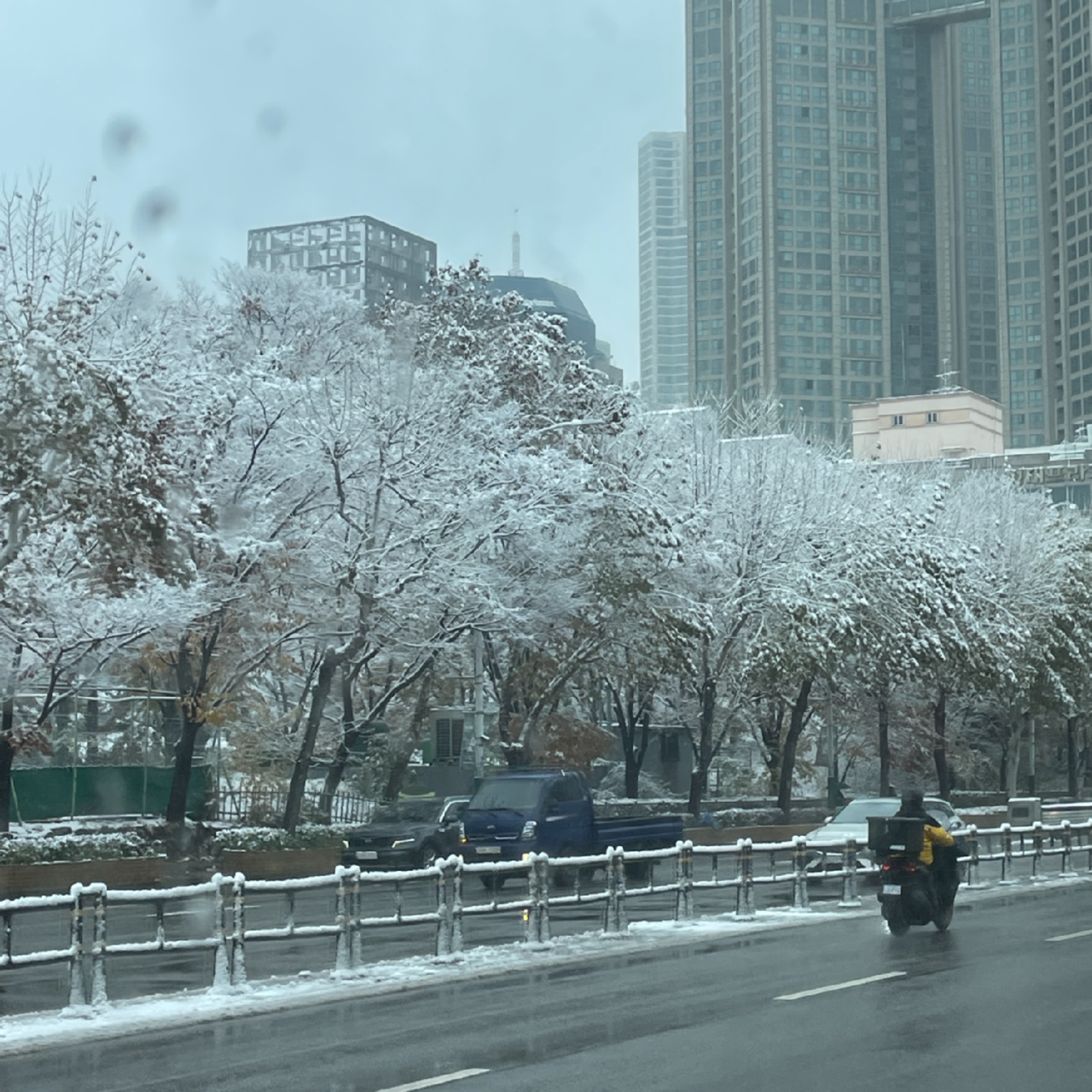 솜이불을 덮은 가로수들, 우산 쓰고 걸어가는 사람들, 모든 게 아름다웠다.