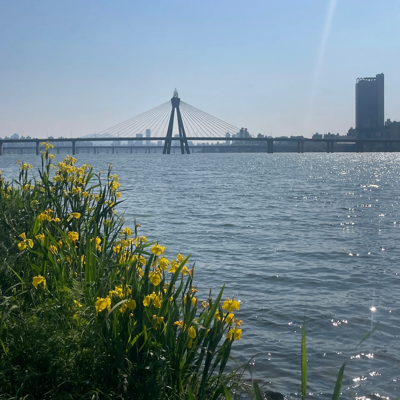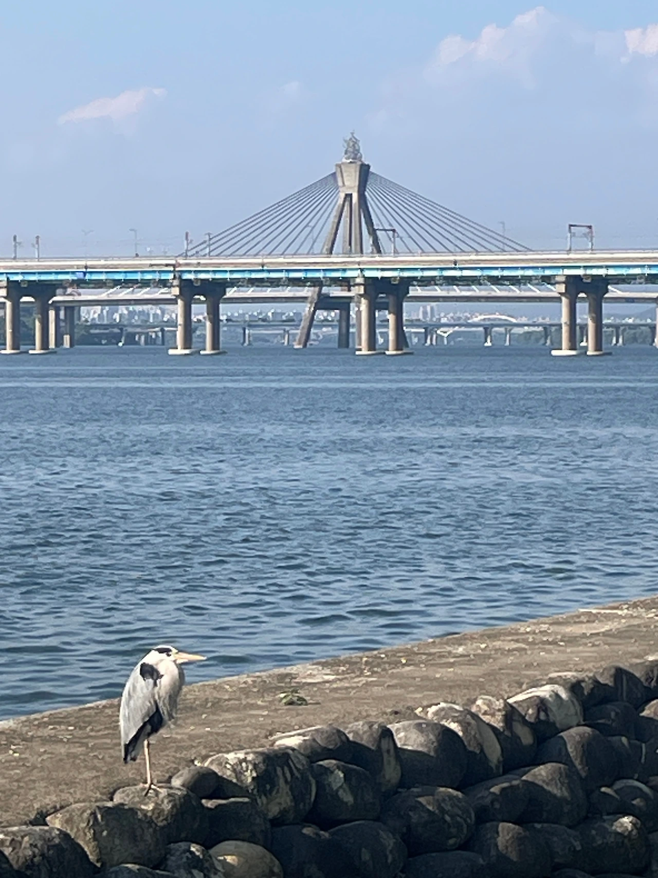 올림픽 대교와 한강, 그리고 한 다리로 서 있는 새 한 마리.