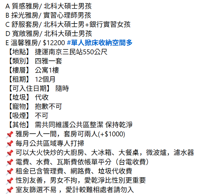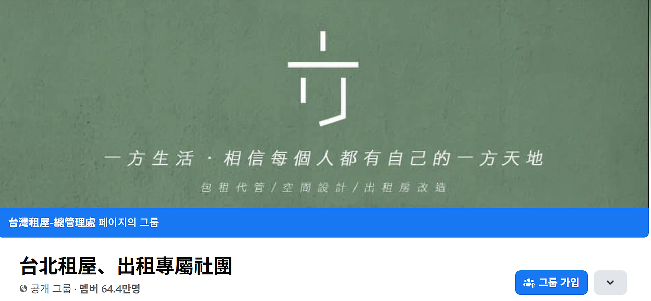 다행히 대만에는 깔끔하고 저렴한 원룸은 별로 없어도 적당한 가격의 쉐어하우스는 많았다. 오히려 쉐하가 (사진상으로는) 원룸보다 훠얼씬 깨끗하고 쾌적해 보였다. 대만, 특히 타이베이는 방값이 생활 수준 대비 턱없이 비싸서 그나마 저렴한 쉐하에서 사는 사람들이 많았기 때문이다. 하지만 591 사이트에는 쉐하 매물은 잘 올라오지 않아서 다른 사이트를 이용해야 했는데, 그 사이트는 뜬금없게도 '페이스북'이었다. 우리나라에서는 인스타에 밀려 한물 간 페북이 대만에서는 쉐하계의 직방 노릇을 하고 있었다. 마지막 페북 접속이 10년 전이었던 한국인에겐 생소하고 신기한 문화였다.