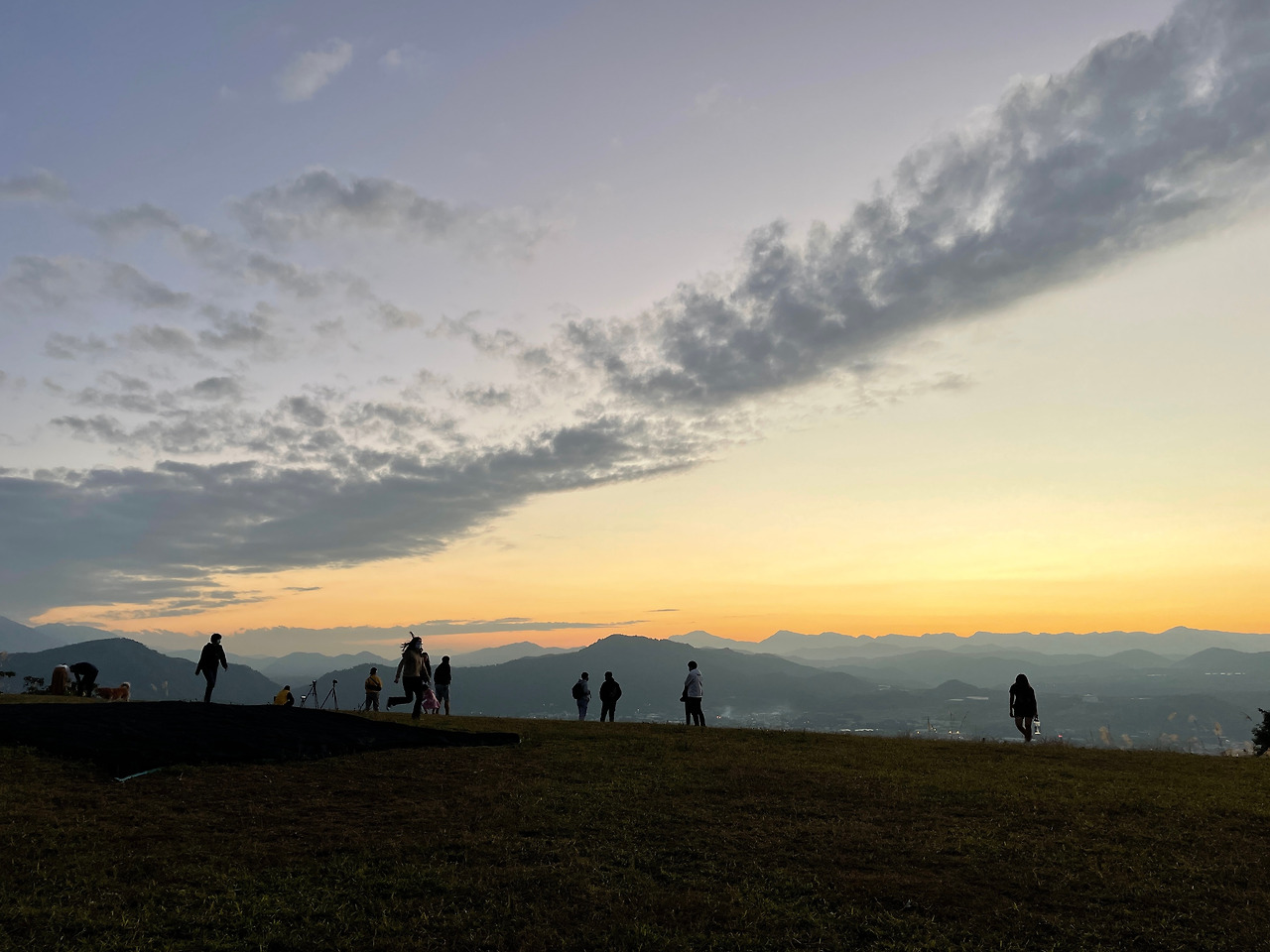뒤돌아 가고 싶은 마음을 꾹꾹 누르며 걸은 지 30분. 드디어 정상에 도착했다. 180도로 쫙 펼쳐진 넓은 잔디밭 위에 서 있는 사람들의 까만 실루엣, 그 뒤에서 은은하게 빛나고 있는 노을, 그 위의 광활한 보랏빛 하늘. 엉덩이의 통증이 단번에 사라지는 풍경이었다.